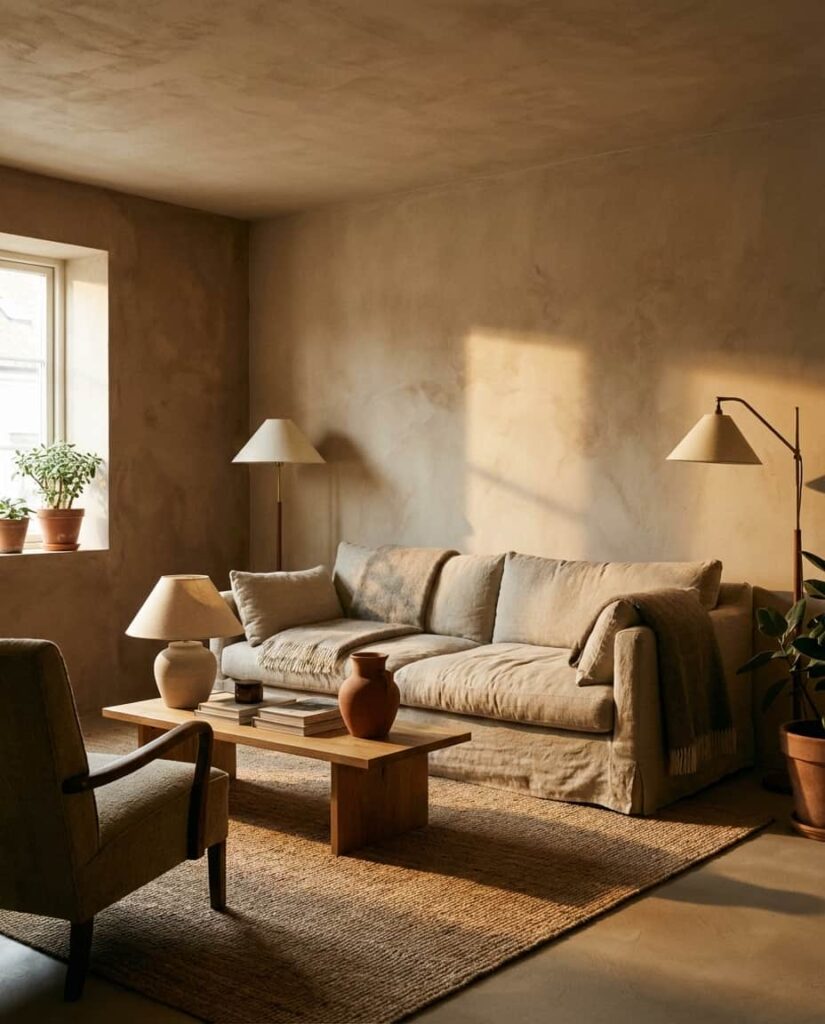 A strong starting point for earthy living rooms is embracing Natural palettes anchored in clay, sand, and stone. In this approach, Paint color ideas focus on Brown, Beige, and soft Grey, balanced with warmer undertones to avoid a flat look. These ideas work especially well in a Small space, where layered neutrals create depth without clutter. I’ve noticed many designers recommend sampling Paint on different walls to observe how light shifts throughout the day. This color scheme feels timeless, quietly cozy, and adaptable to evolving decor tastes, making it a long-term design win rather than a trend-driven risk.