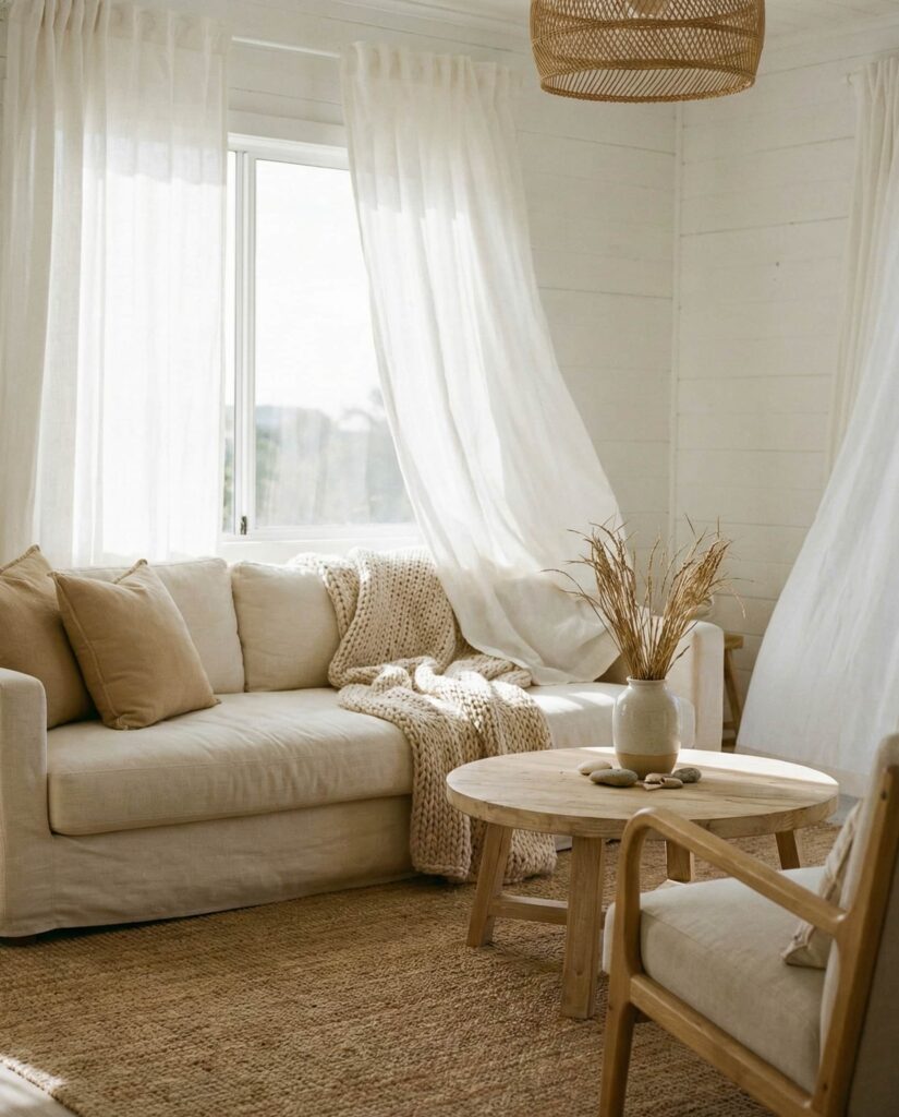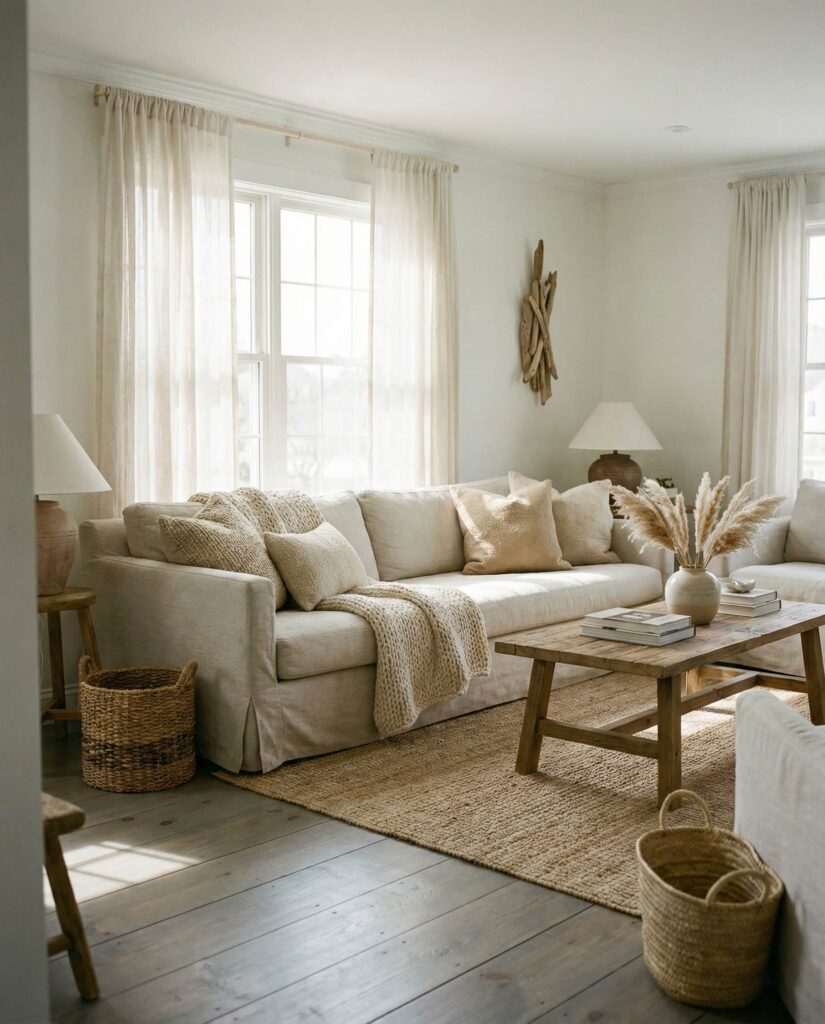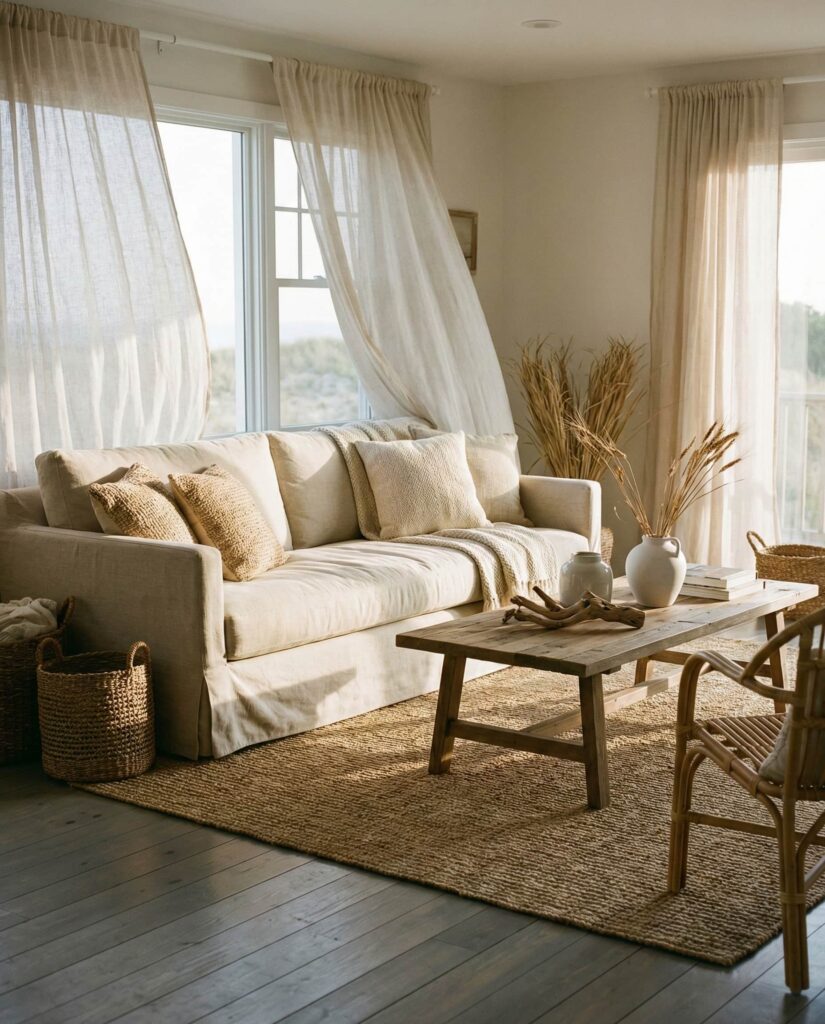 10. Coastal Earthy Living with Soft Layers