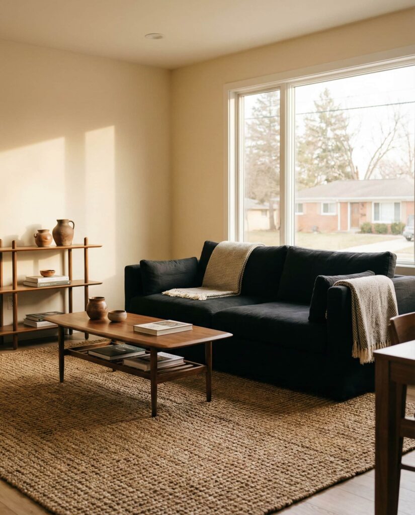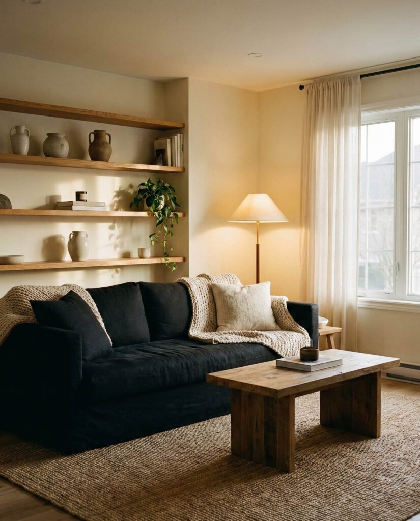 A Black couch can feel surprisingly grounded when used thoughtfully in earthy living rooms. Instead of stark contrast, this approach relies on Natural textures, warm woods, and layered Brown and Beige accents to soften the look. These decor ideas work especially well in open layouts where light balances darker furniture. I’ve noticed designers often pair black seating with woven Rug choices and subtle Wall decor to keep the aesthetic inviting. The result is a confident color scheme that feels modern, calm, and quietly cozy rather than dramatic.