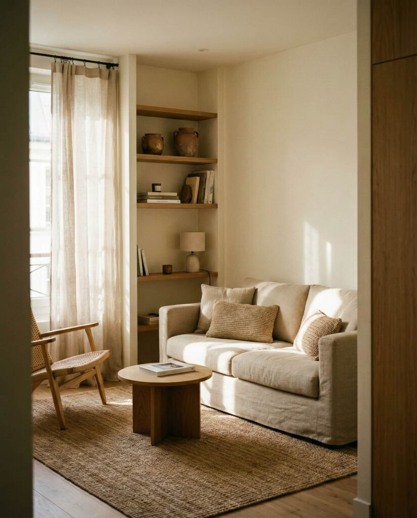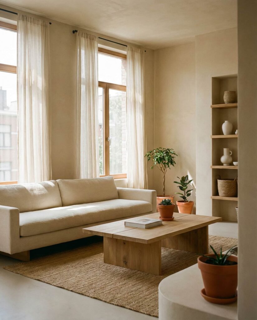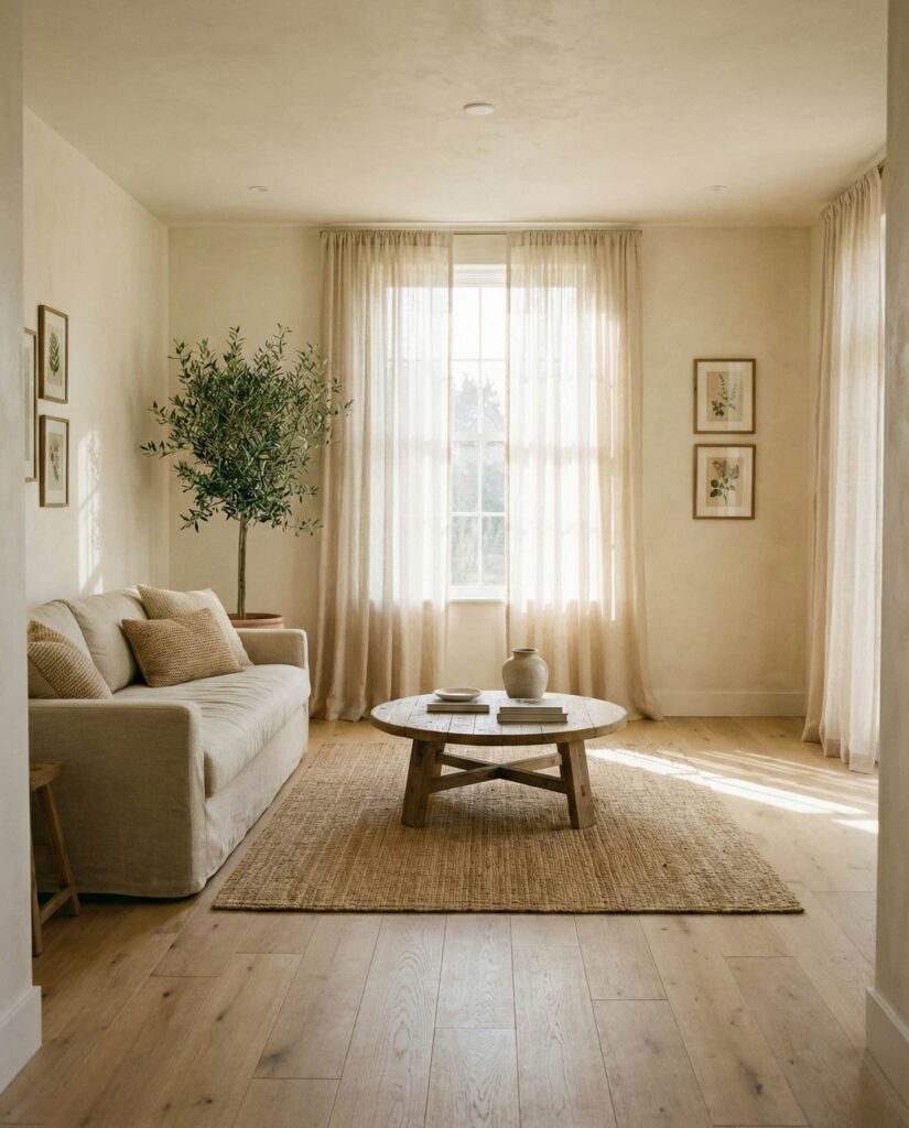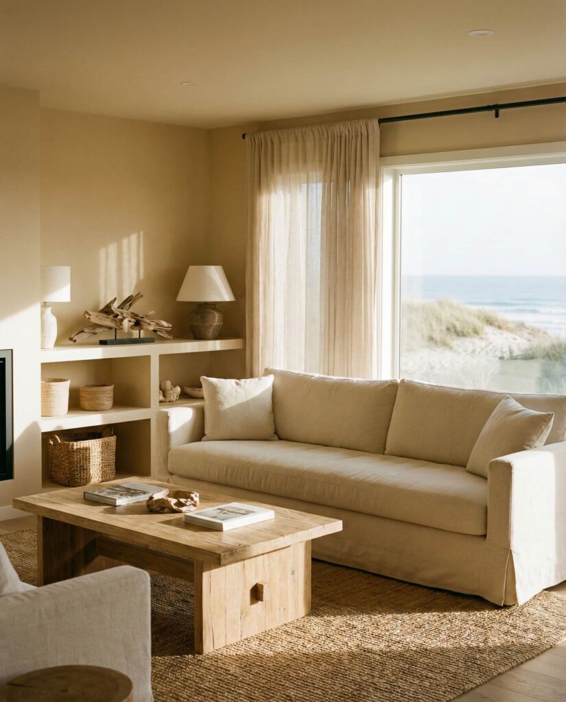 A restrained Coastal approach fits seamlessly into earthy living rooms when overt themes are avoided. Sand-inspired Beige, weathered wood, and airy Curtains shape a relaxed aesthetic. These ideas appeal to homeowners seeking calm rather than decoration. I’ve noticed this style feels timeless because it borrows from nature rather than trends. The room feels light, grounded, and quietly cozy.