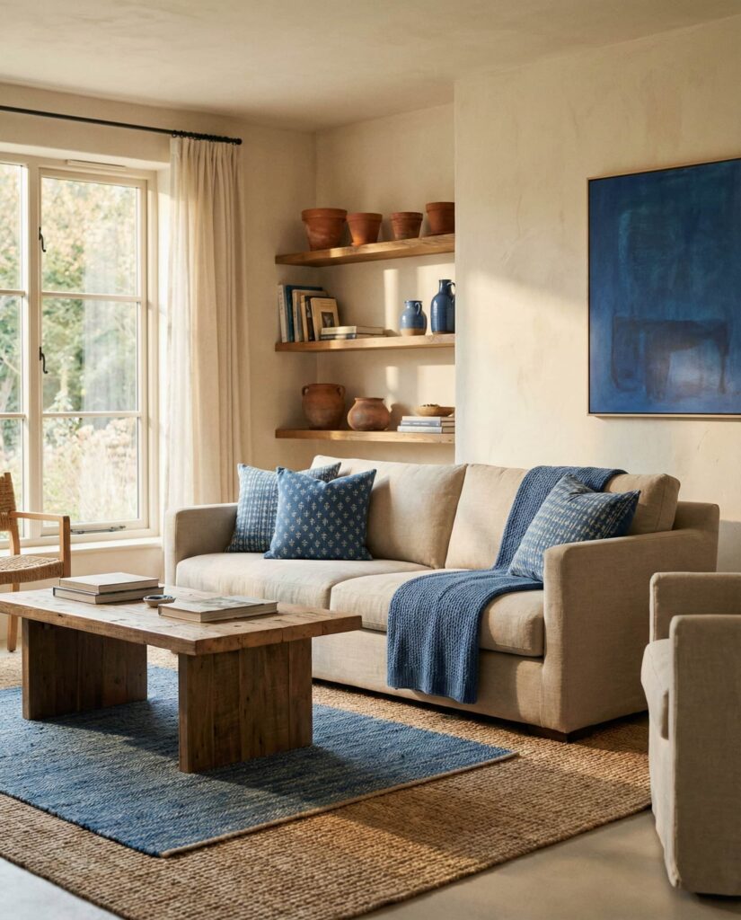 Rather than committing to a Blue couch, many earthy living rooms use blue through pillows, art, or Rug patterns. Muted Blue pairs naturally with Brown, Grey, and warm woods, enhancing the color scheme without dominating it. These decor ideas are perfect for homeowners who like subtle color shifts over time. From observation, blue accents add calm and balance while preserving a Natural aesthetic that feels timeless and flexible.