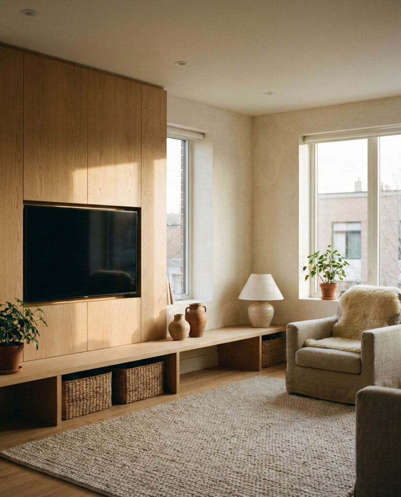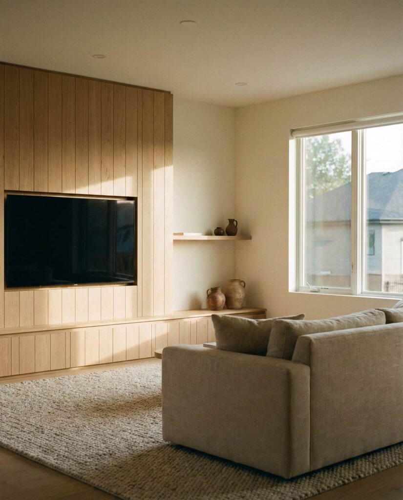 16. Earthy TV Wall That Blends into the Space