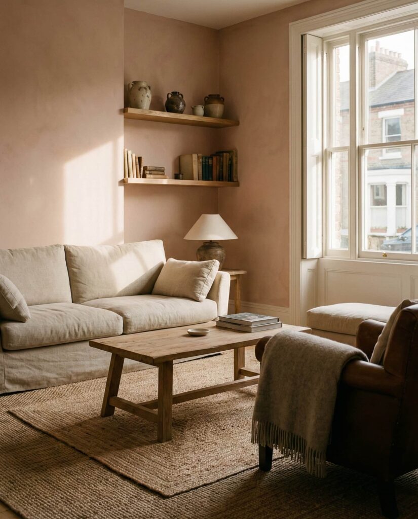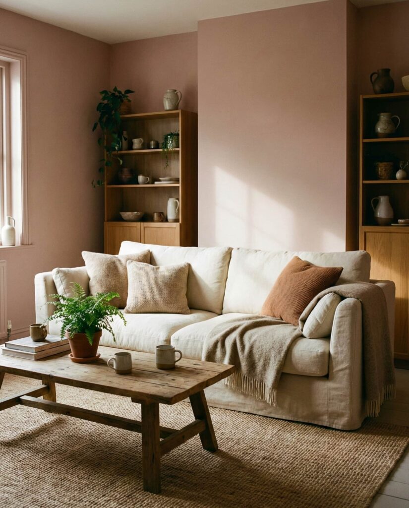 Soft Pink has emerged as a gentle neutral in earthy living rooms, especially when grounded with Brown and Beige. Clay or blush tones feel warm rather than playful, adding emotional softness to the color scheme. These decor ideas work well in both modern and traditional homes. From experience, pink walls or accents glow beautifully in evening light, enhancing a cozy and welcoming aesthetic.