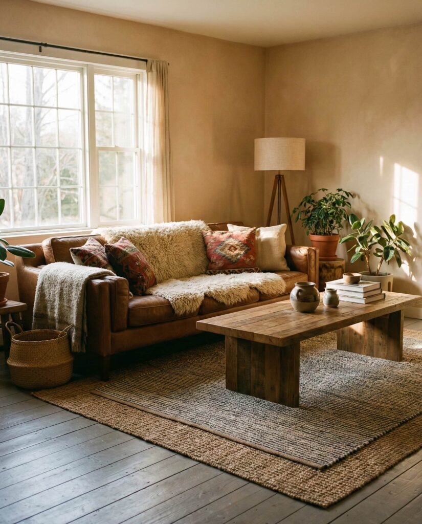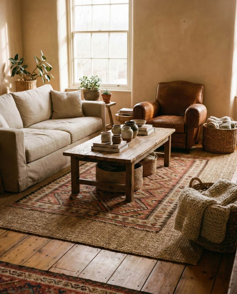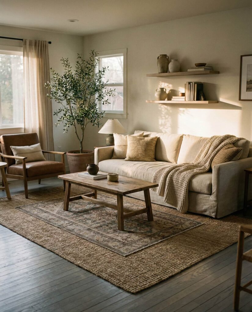 Layering a Rug over natural flooring adds instant depth to earthy living rooms. Mixing flatweaves with plush textures enhances warmth while reinforcing the color scheme. These decor ideas are practical, especially in family homes, and visually soften open spaces. I’ve found layered rugs make rooms feel lived-in and welcoming. The effect is tactile, relaxed, and deeply cozy, aligning perfectly with earthy designs.