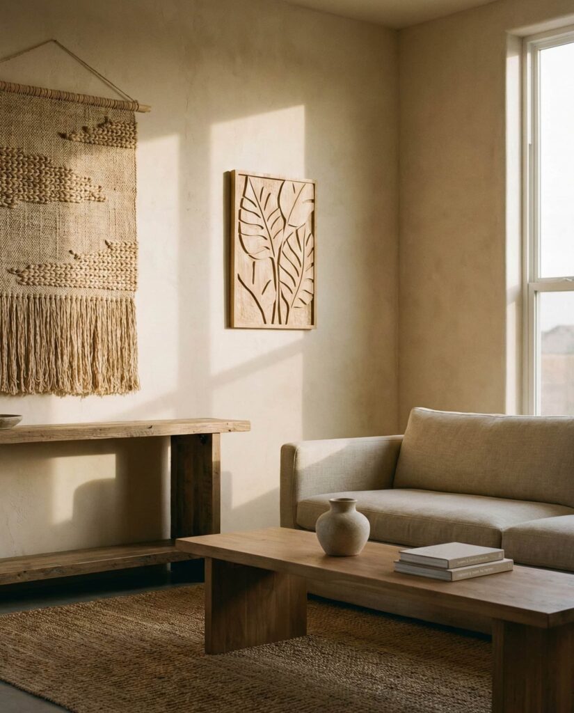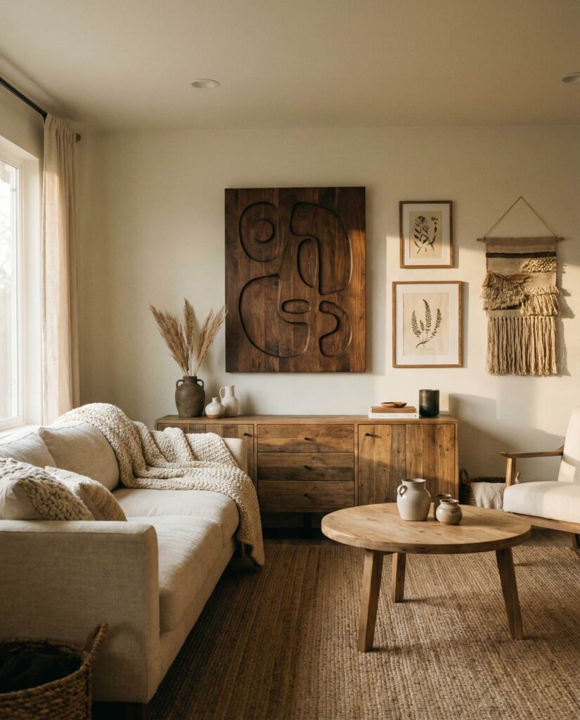 Using Wall decor rooted in nature is one of the most understated yet effective decor ideas for earthy living rooms. Materials like carved wood panels, woven art, clay plates, or framed botanical prints reinforce a Natural aesthetic without overwhelming the space. This idea works across styles, from modern to Mid century, and pairs easily with Brown, Beige, or soft Grey walls. From my experience, natural wall pieces age better than trendy art and quietly elevate the color scheme. The result feels personal, grounded, and effortlessly cozy, allowing the room to breathe while still telling a story.