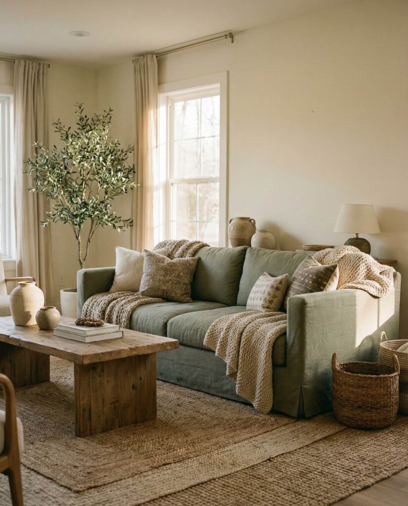A Green couch has become a defining feature in modern earthy living rooms, acting as both statement and anchor. Earth-inspired colors like olive or moss connect effortlessly with Natural materials and organic textures. These decor ideas work across styles, from rustic to contemporary, and pair beautifully with Brown wood or Beige walls. I’ve seen homeowners hesitant at first, only to realize green behaves like a neutral over time. The result is a welcoming aesthetic that feels calm, grounded, and refreshingly timeless.