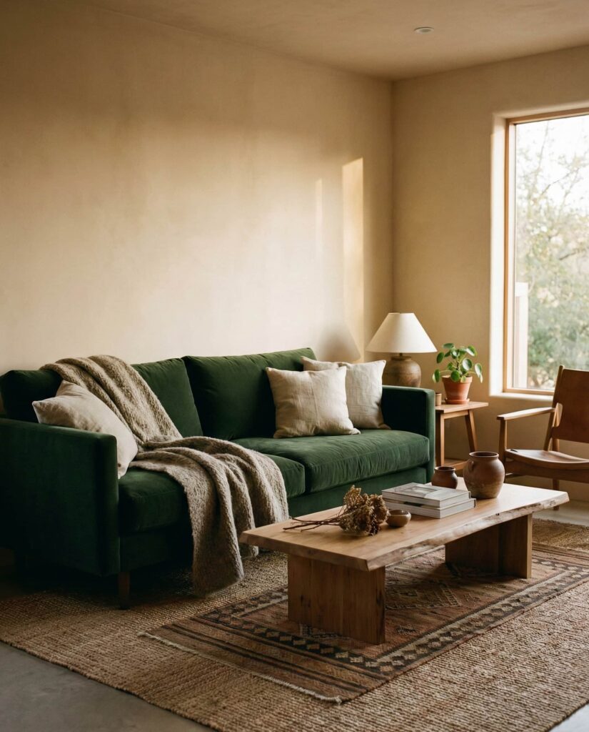 3. Green Couch as the Heart of an Earthy Space