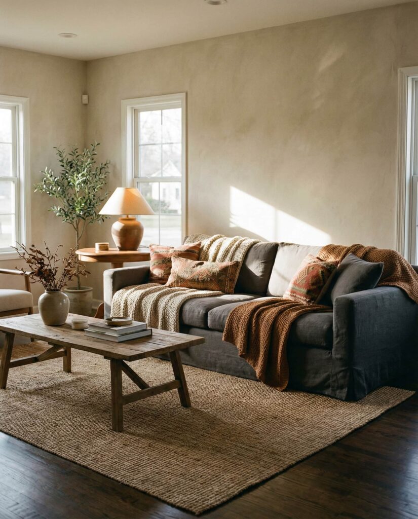 Decor with gray wood floors requires warmth to avoid a cold feel. In earthy living rooms, this comes from Natural fibers, layered Rug choices, and warm-toned furniture. Brown, Beige, and muted Green help rebalance the palette. I’ve seen gray floors succeed when paired with textured decor rather than sleek finishes. The space feels grounded, modern, and effortlessly cozy.