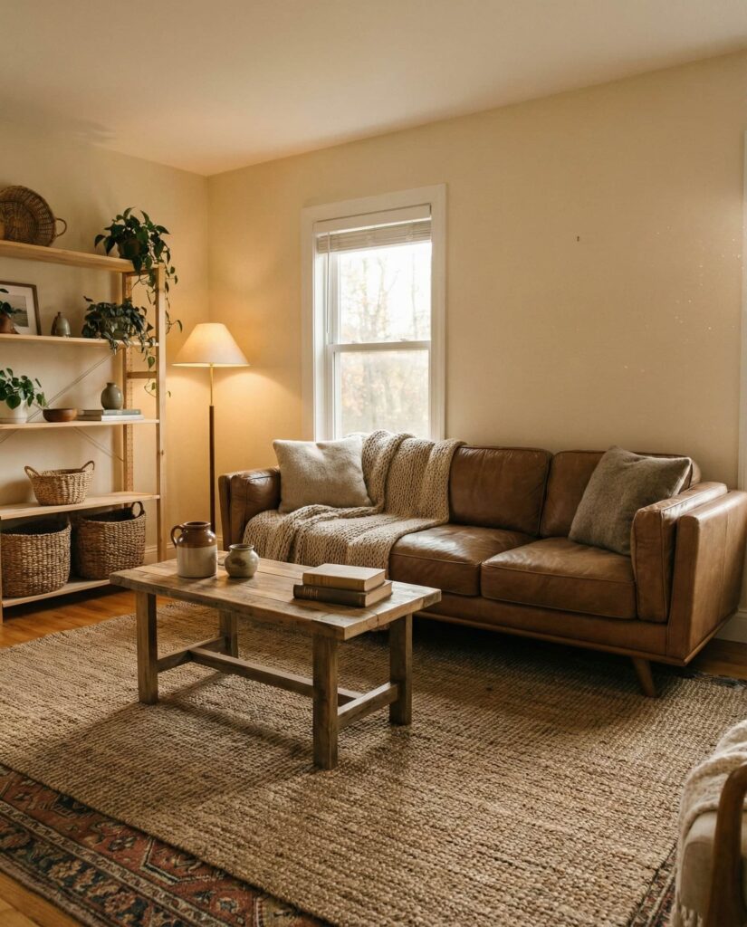 A Brown couch brings instant warmth and familiarity, making it a classic choice for earthy living rooms. Leather or fabric versions both work beautifully with Natural woods and woven decor. These ideas lean into comfort, aging gracefully over time rather than chasing trends. I’ve noticed brown seating pairs especially well with layered Rug textures and subtle Paint contrasts. The overall aesthetic feels grounded, dependable, and deeply cozy, perfect for family-focused living rooms.