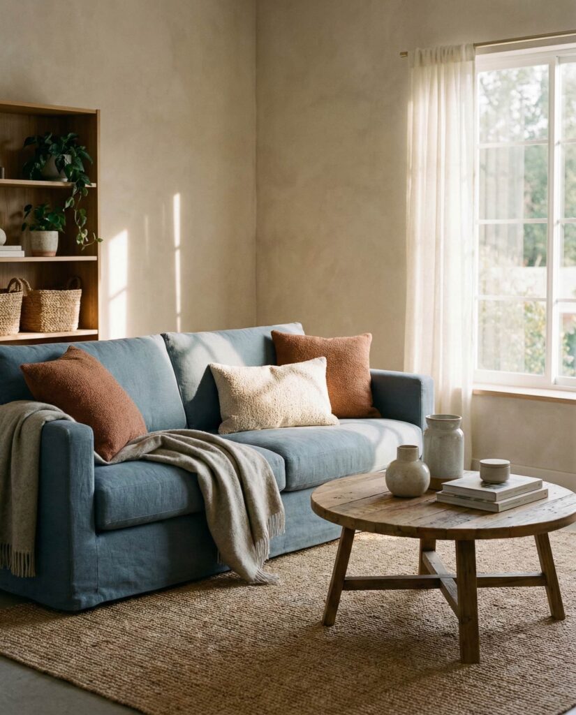 A Blue couch might seem unexpected in earthy living rooms, but when paired thoughtfully, it works beautifully. Muted Blue shades combined with Brown, Beige, and warm woods maintain a cohesive color scheme. These decor ideas often appeal to homeowners wanting subtle personality without overpowering the room. Designers frequently suggest grounding blue with organic textures to preserve a Natural feel. The result is a calm, layered aesthetic that feels fresh yet rooted.