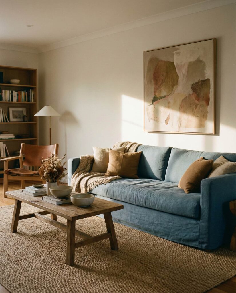 6. Blue Couch with Earthy Balance