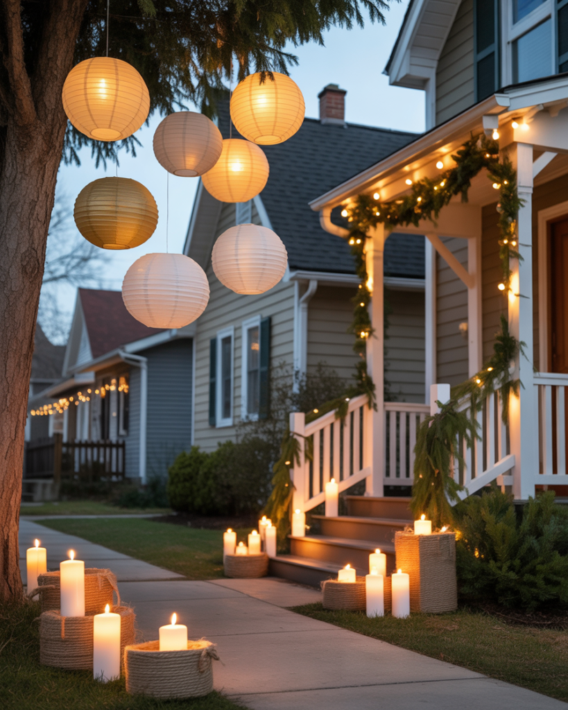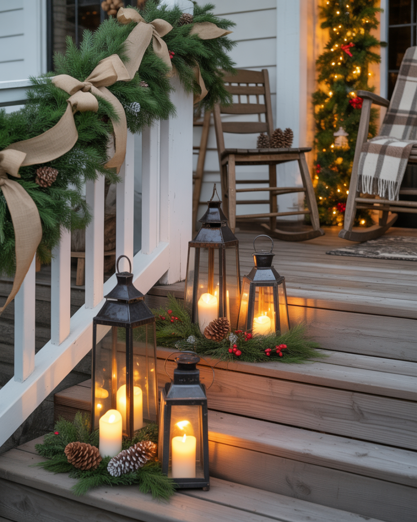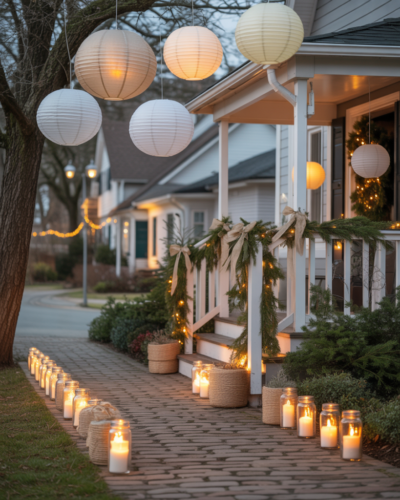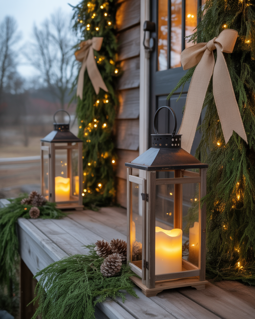 For a farmhouse yet elegant look, gather rustic lanterns, pine branches, and neutral ribbons. Arrange them by your front door or windows for simple, easy diy charm. It’s one of those ideas yard styles that work beautifully in the UK or U.S.—warm, understated, and effortlessly classy.