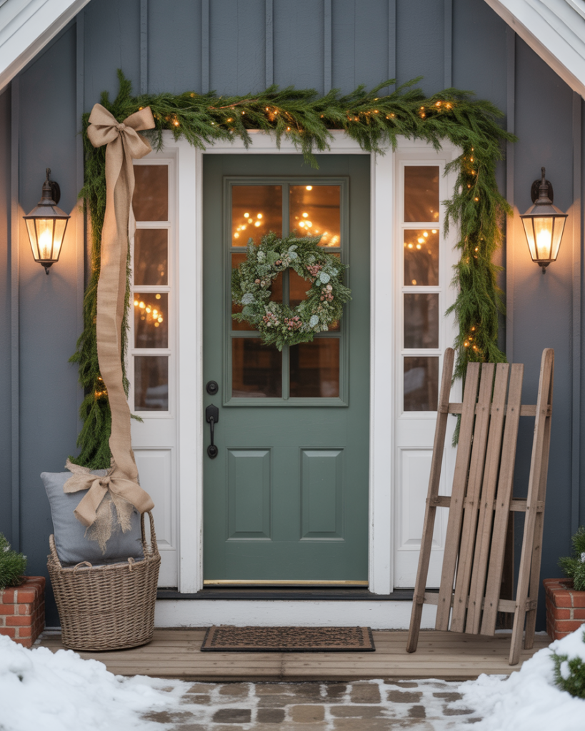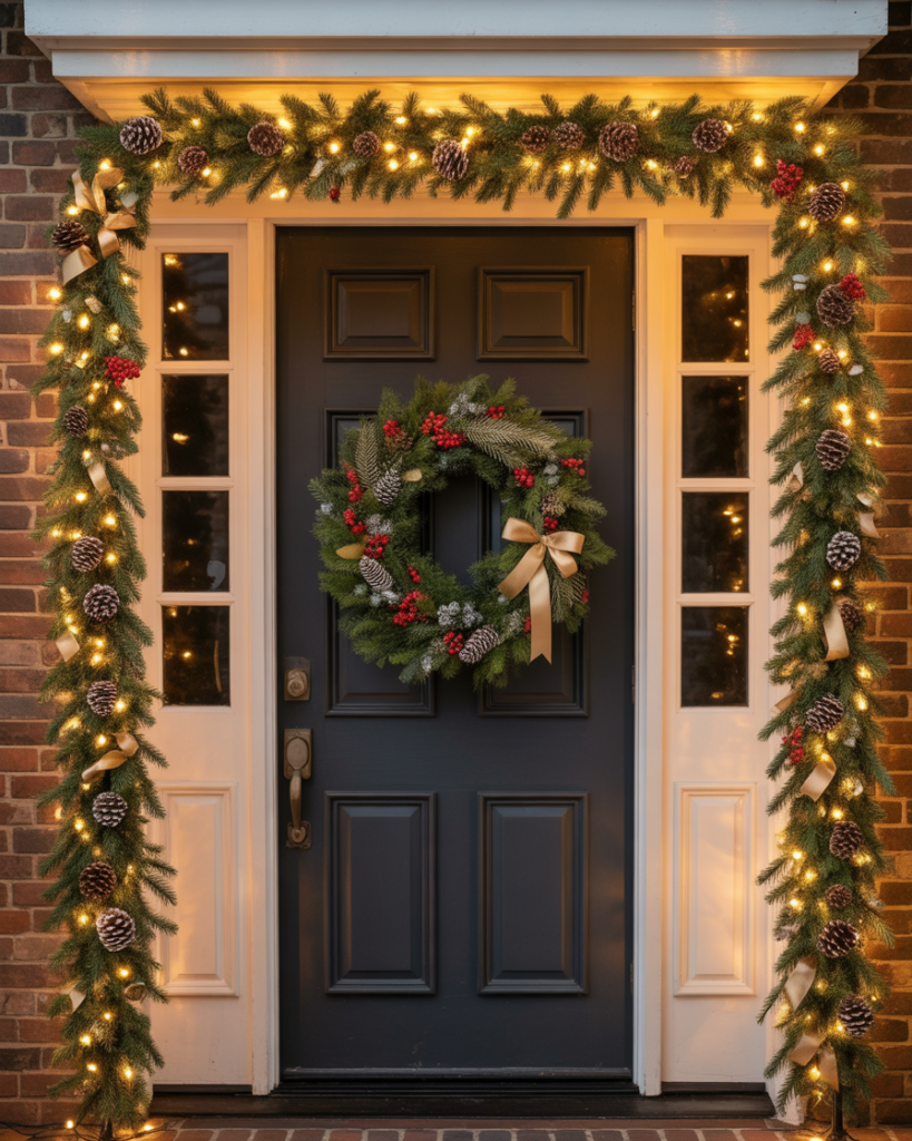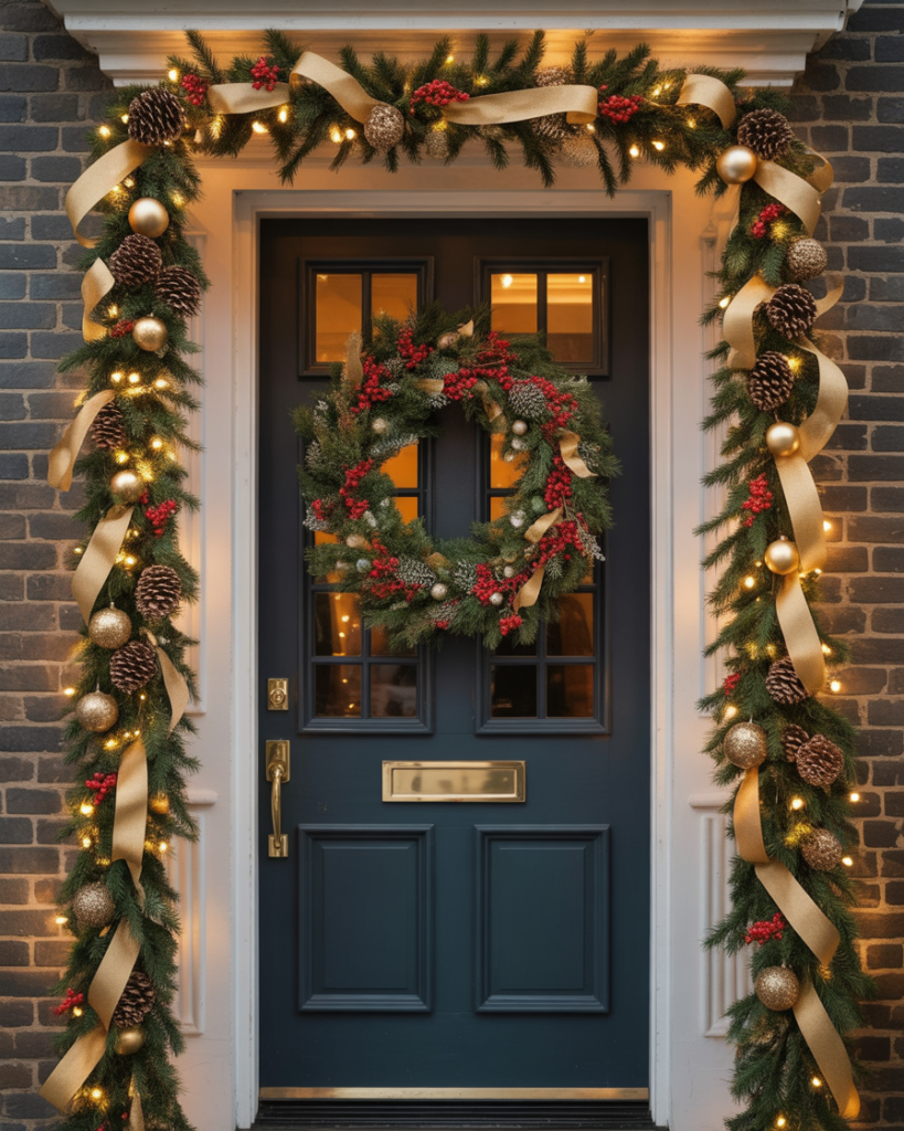 Create drama by framing your front door with cascading garlands full of pine, berries, and ribbons. Add yard decorations like small evergreens nearby for balance. This simple diy setup feels elegant and festive, especially when layered with twinkling lights and gold accents for that classic Christmas charm.