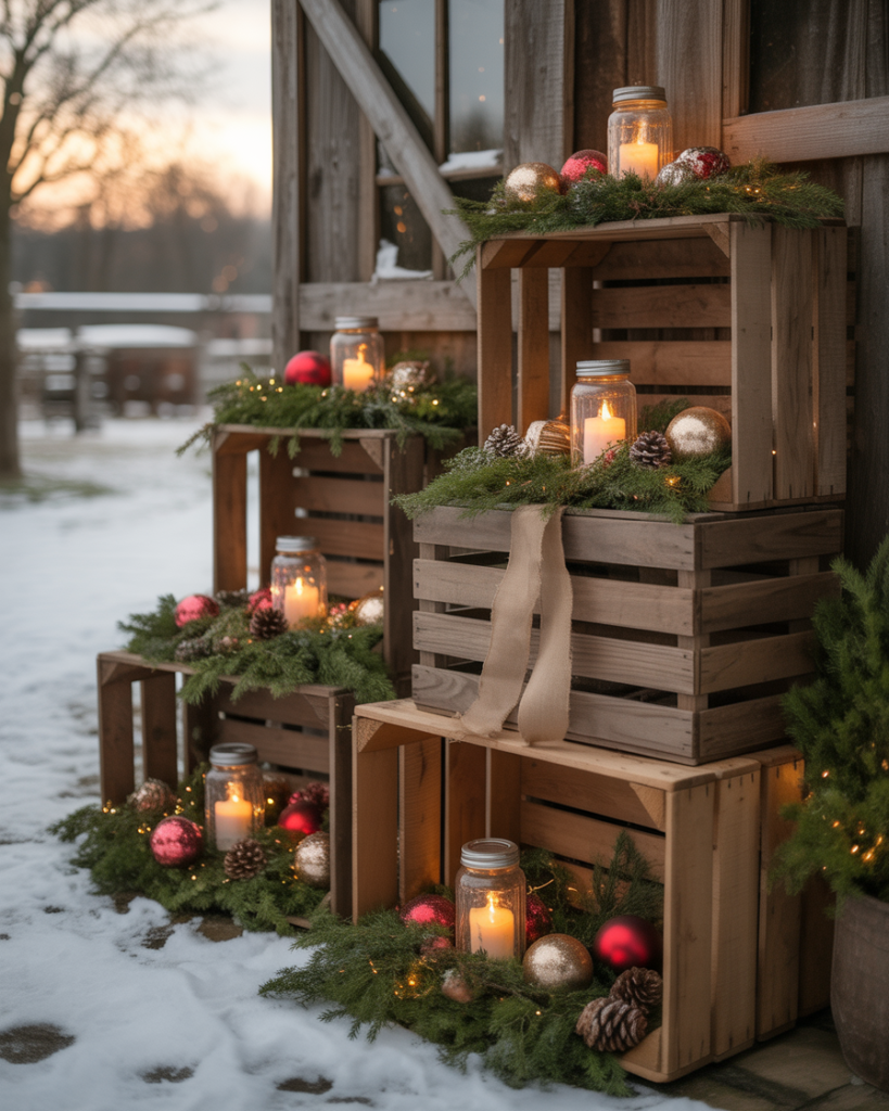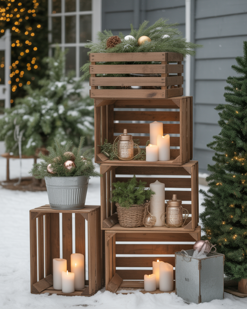 Transform wooden crates into cozy yard decorations diy setups by stacking them and filling each level with ornaments, candles, or greenery. It’s cheap, creative, and brings farmhouse personality to your yard or porch. Try mixing natural textures with a few elegant metallic touches for a balanced look.