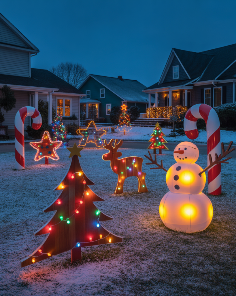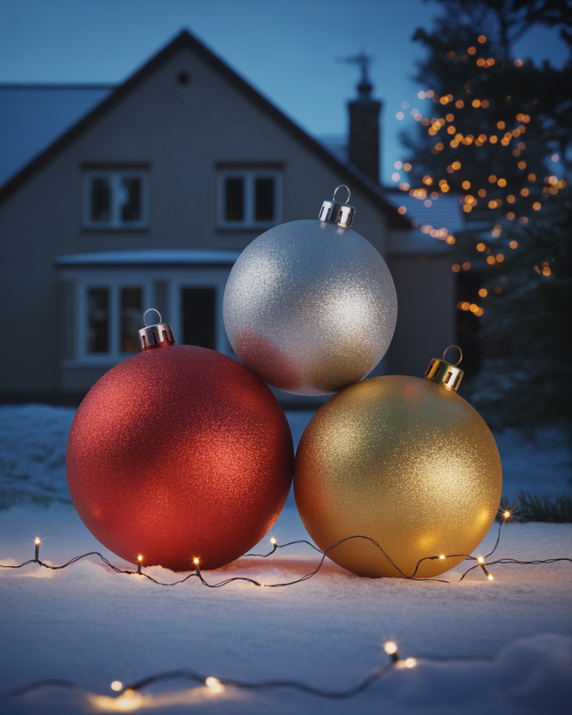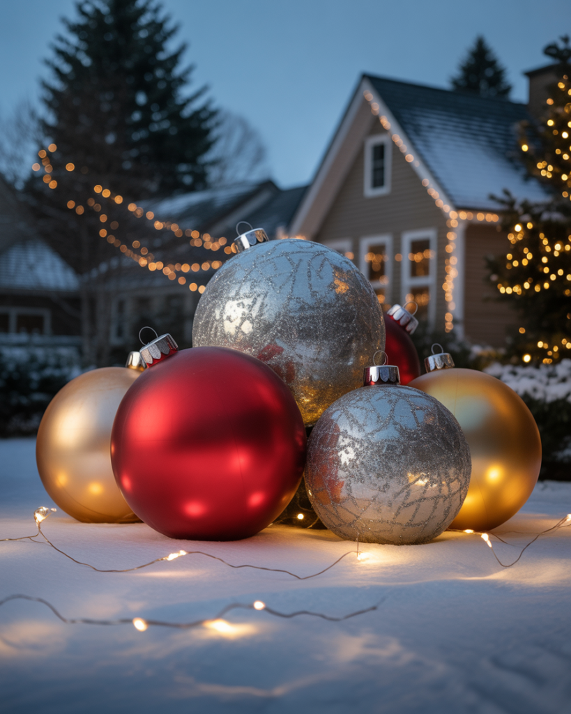 Oversized ornaments add playful scale to yards big or small. Use plastic balls painted in metallic tones or create your own easy diy versions with repurposed materials. These yard decorations ideas feel classy and festive—perfect near bushes, front doors, or windows for maximum impact day or night.