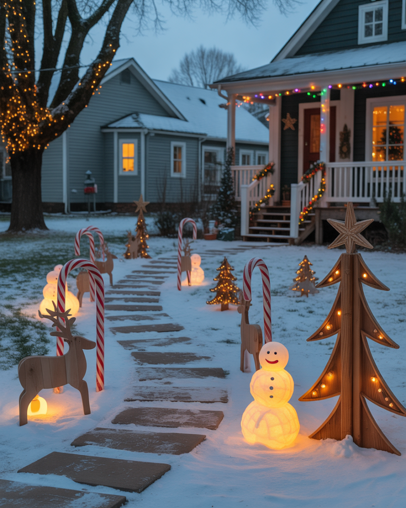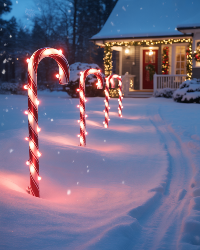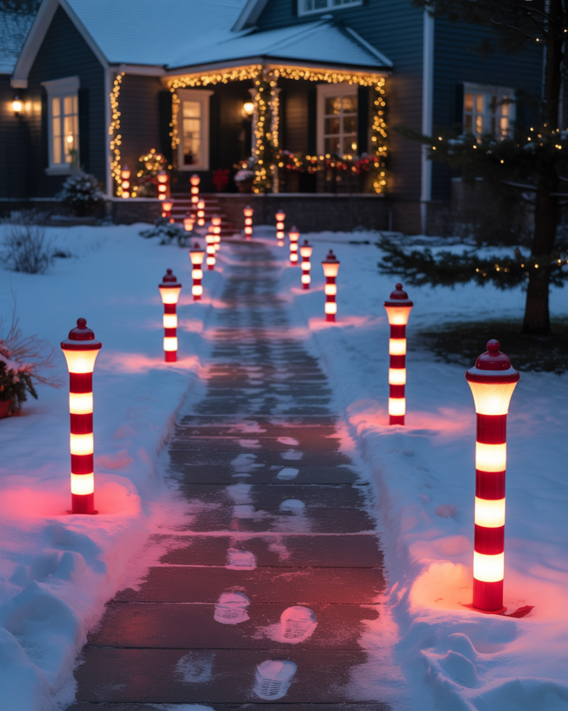 Line your walkway with candy cane poles, alternating red and white lights for a magical path. This simple yet elegant diy touch connects your porch and yard decorations beautifully. Add a Baby It’s Cold sign or a small wreath at the gate to make guests feel instantly welcomed.