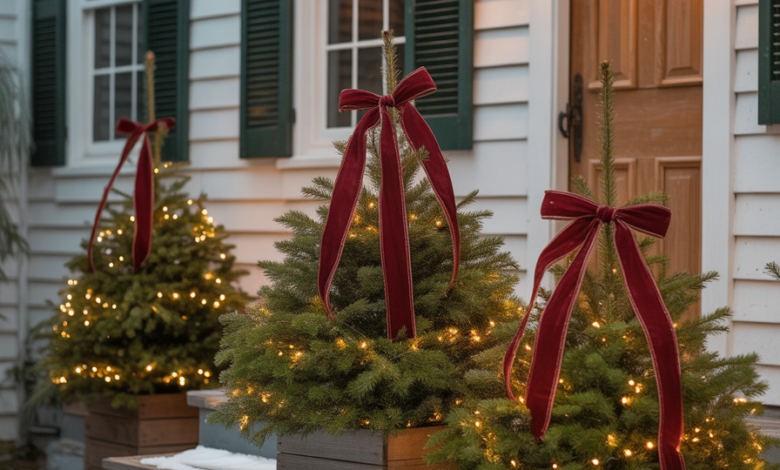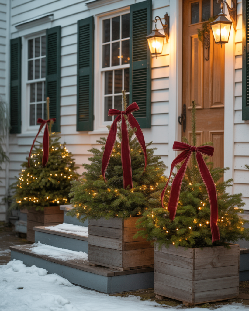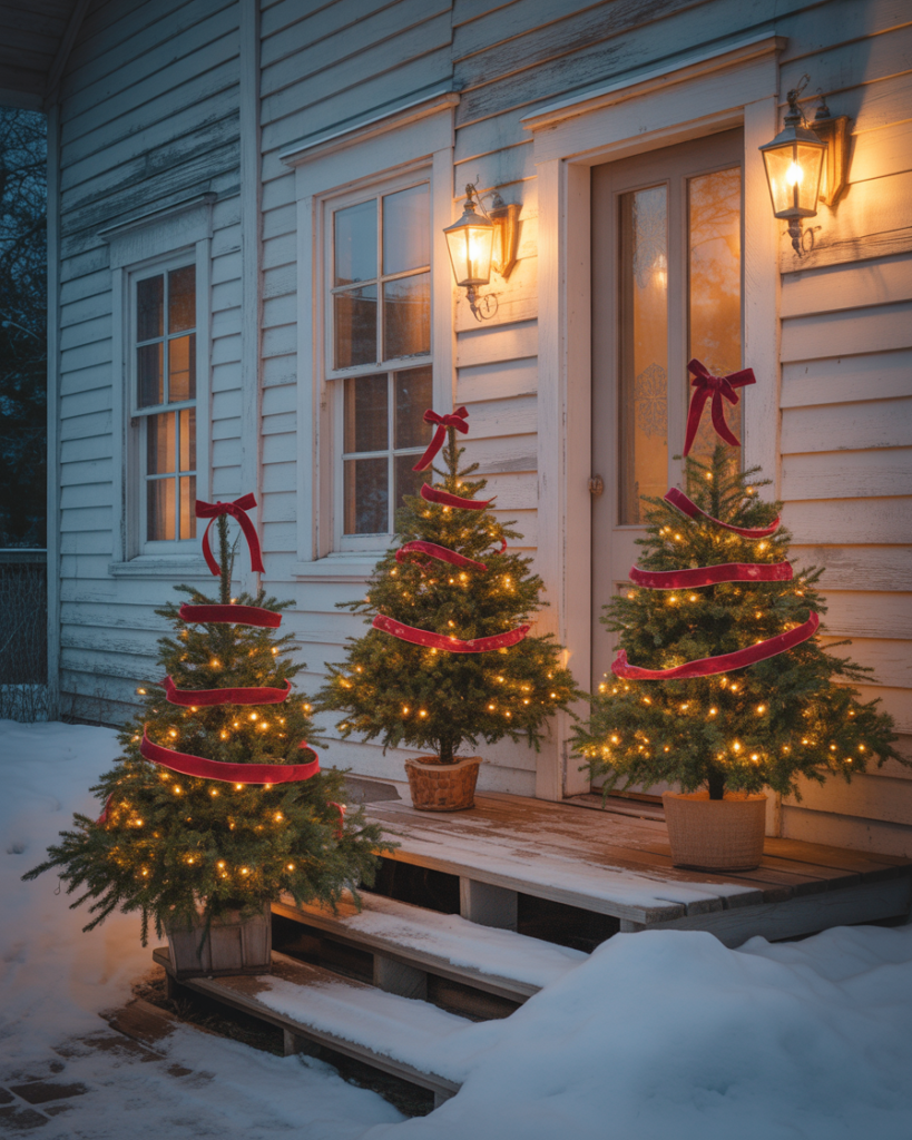 Instead of one big tree inside, bring three small trees outside your porch or front door. Decorate them with yard decorations diy like ribbons, pinecones, or cheap ornaments. This layered look feels classy and adds dimension, especially when each tree glows with its own strand of white lights.