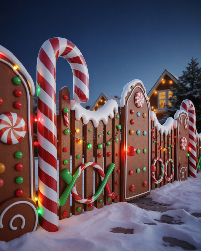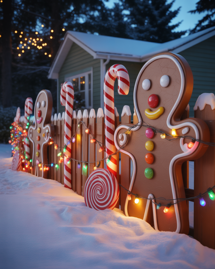 Extend your gingerbread theme by decorating your fence! Paint wood panels with candy motifs or outline posts with colorful lights. It’s a fun diy idea that makes your yard decorations stand out and ties into your house theme. Guests will love this playful nod to childhood nostalgia.