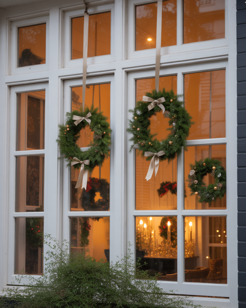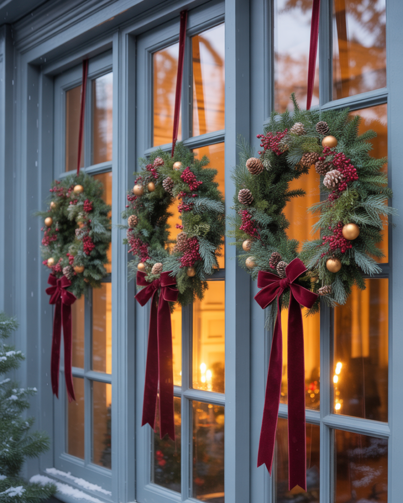 Turn your windows into art by hanging different-sized wreaths at varying heights. Use neutral ribbons for an elegant farmhouse look or red velvet for classic style. This easy diy trick draws attention to your house exterior and brings balance to your yard decorations from every view.