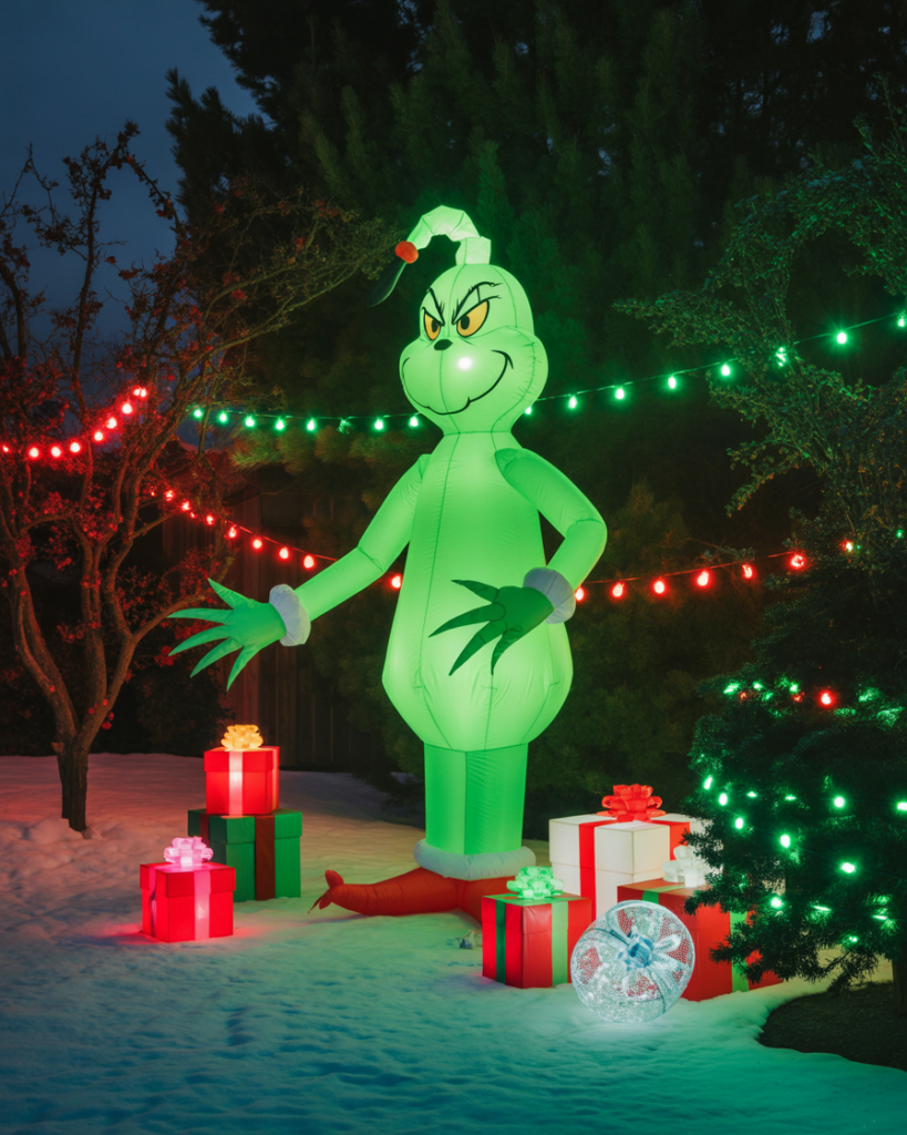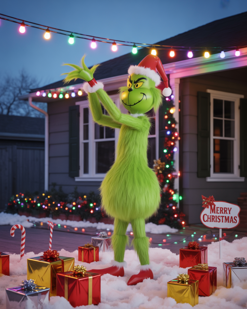 Inject humor with a Grinch corner among your yard decorations. Paint plywood cutouts or use inflatable versions to add a mischievous twist to your yard decorations ideas. Pair it with bold green lights, playful signage, and faux presents to make your yard the most talked-about on the block. Kids and adults alike will grin.