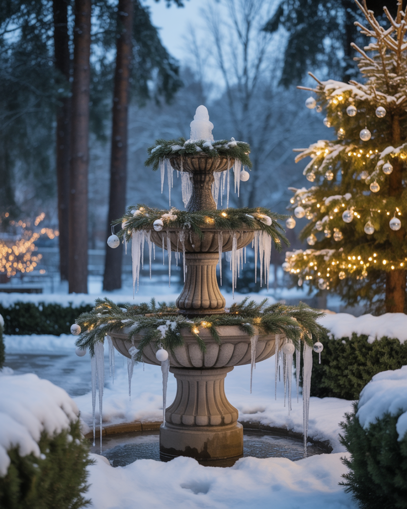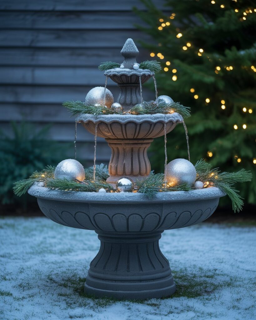 If you have a garden feature like a fountain or birdbath, turn it into a yard decorations winter wonderland theme centerpiece. Fill it with pine sprigs, lights, and ornaments for a frosty elegant touch. Even simple diy efforts here look magical, reflecting the glow of nearby yard decorations.