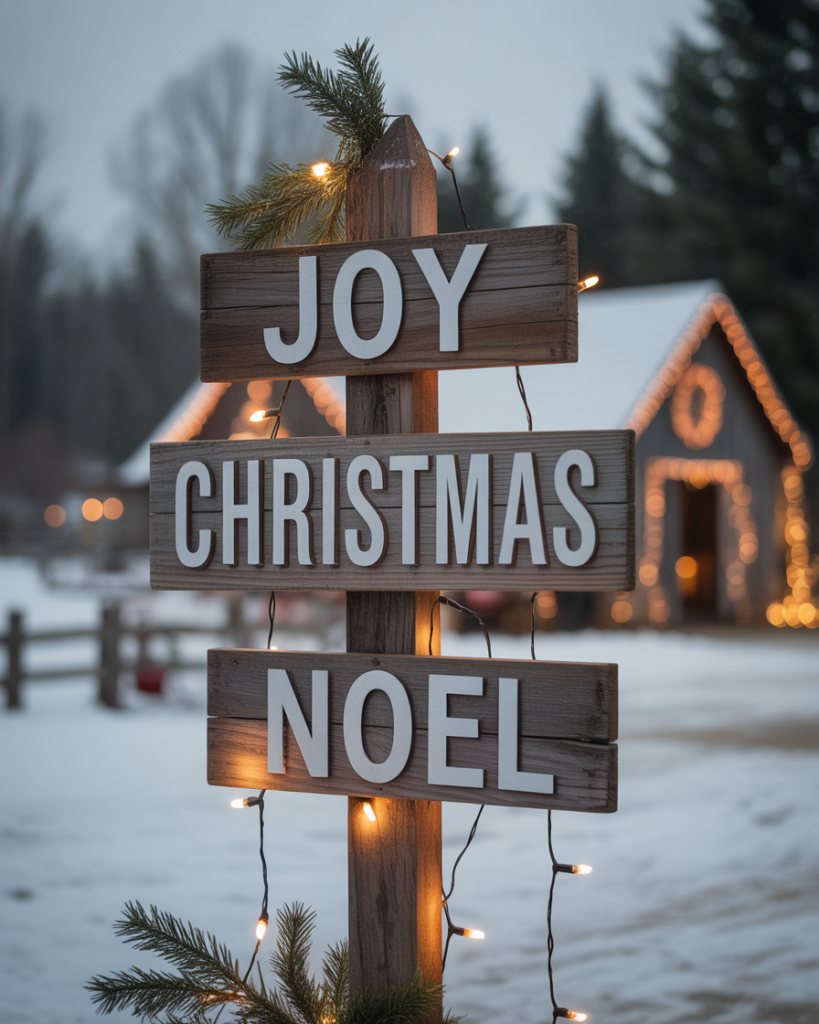 Craft a wooden signpost with festive phrases like “Joy,” “Christmas,” or “Noel.” This yard decorations diy accent adds personality to your yard or porch. Paint it in rustic tones or classic red and white for charm. It’s an easy weekend project with big holiday payoff.
