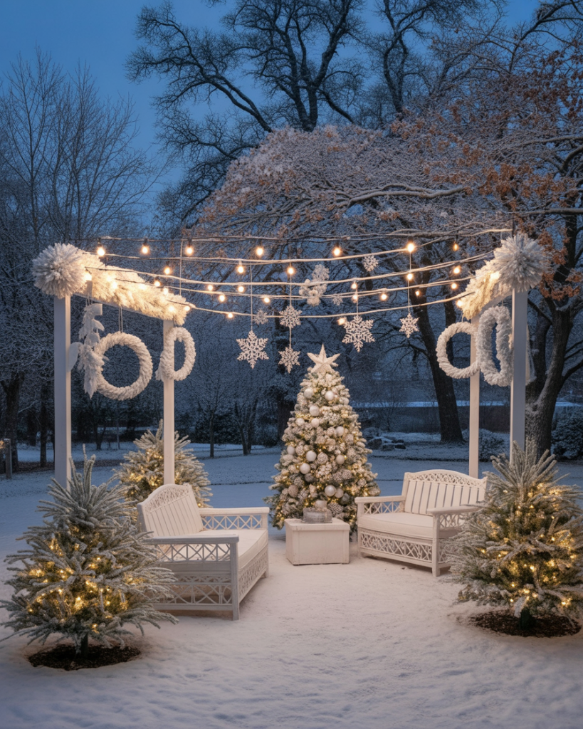 Few ideas feel more timeless than an all-white yard decorations winter wonderland theme. Use glowing lights, shimmering snowflakes, and frosted trees for an elegant look that feels peaceful. Even cheap materials like paper stars or white spray-painted branches can look classy when styled thoughtfully.