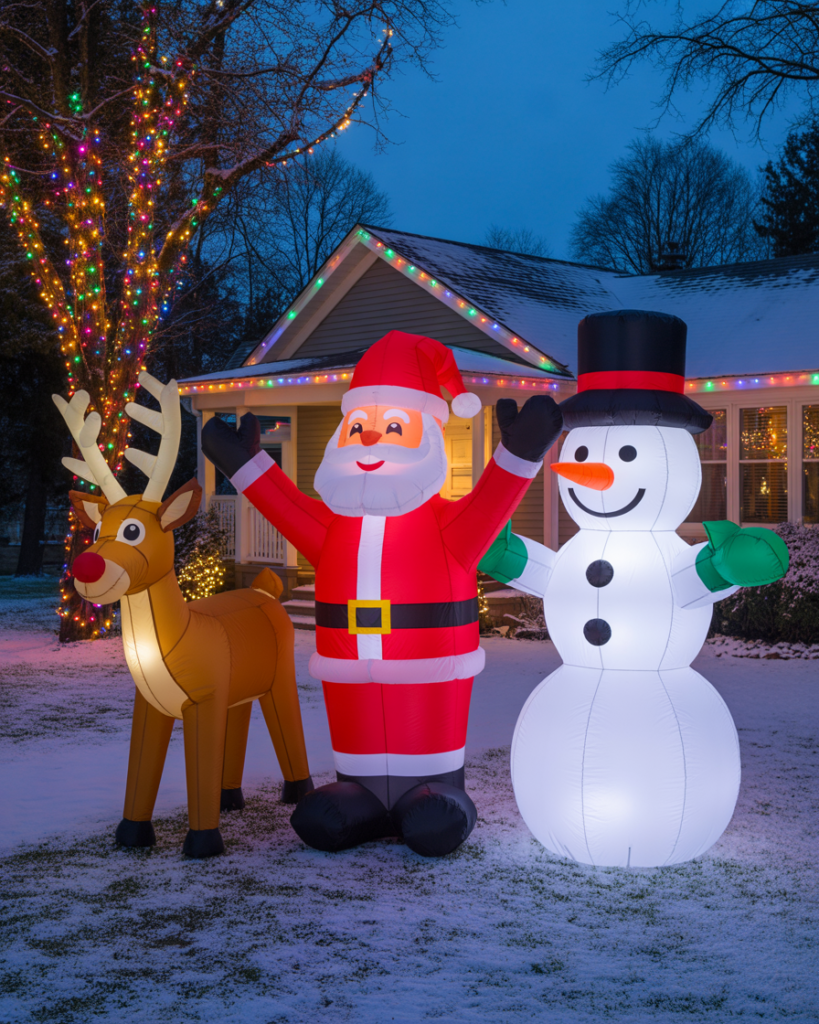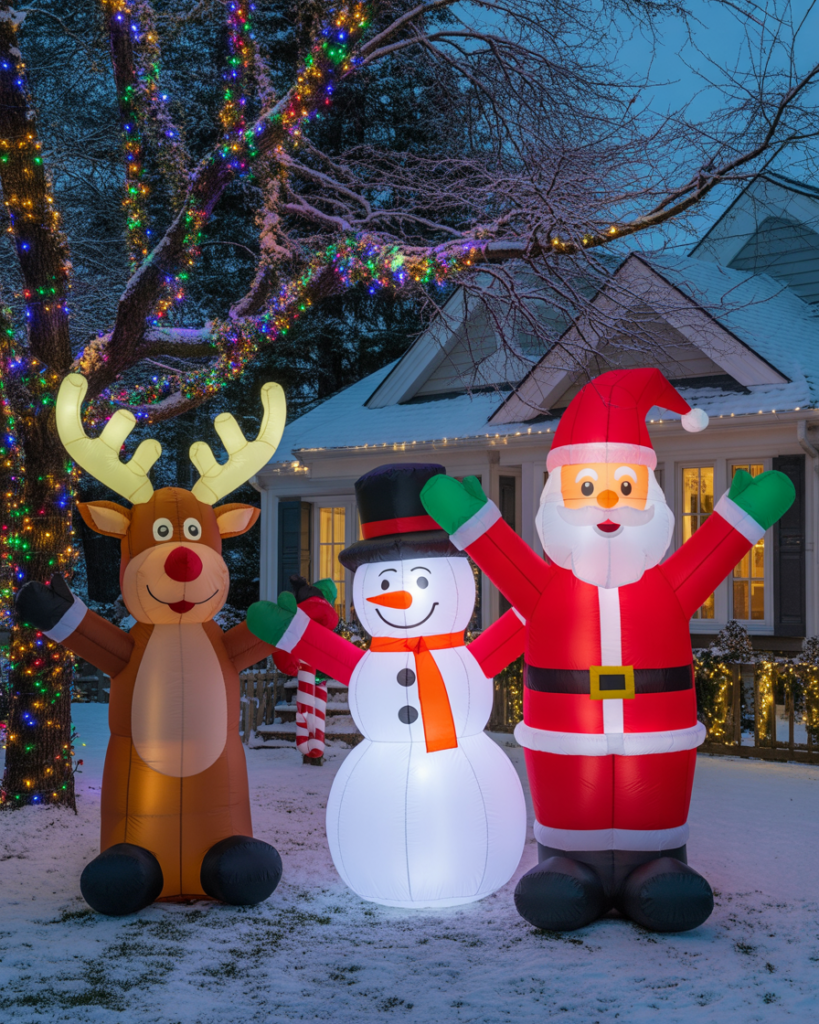 Inflatables bring instant joy and scale to yards of all sizes. From Santa’s sleigh to nutcrackers, these large and easy diy setups add cheerful animation. Surround them with simple yard decorations and spotlights for a balanced scene that’s festive but not cluttered. Great for families who love playful displays.