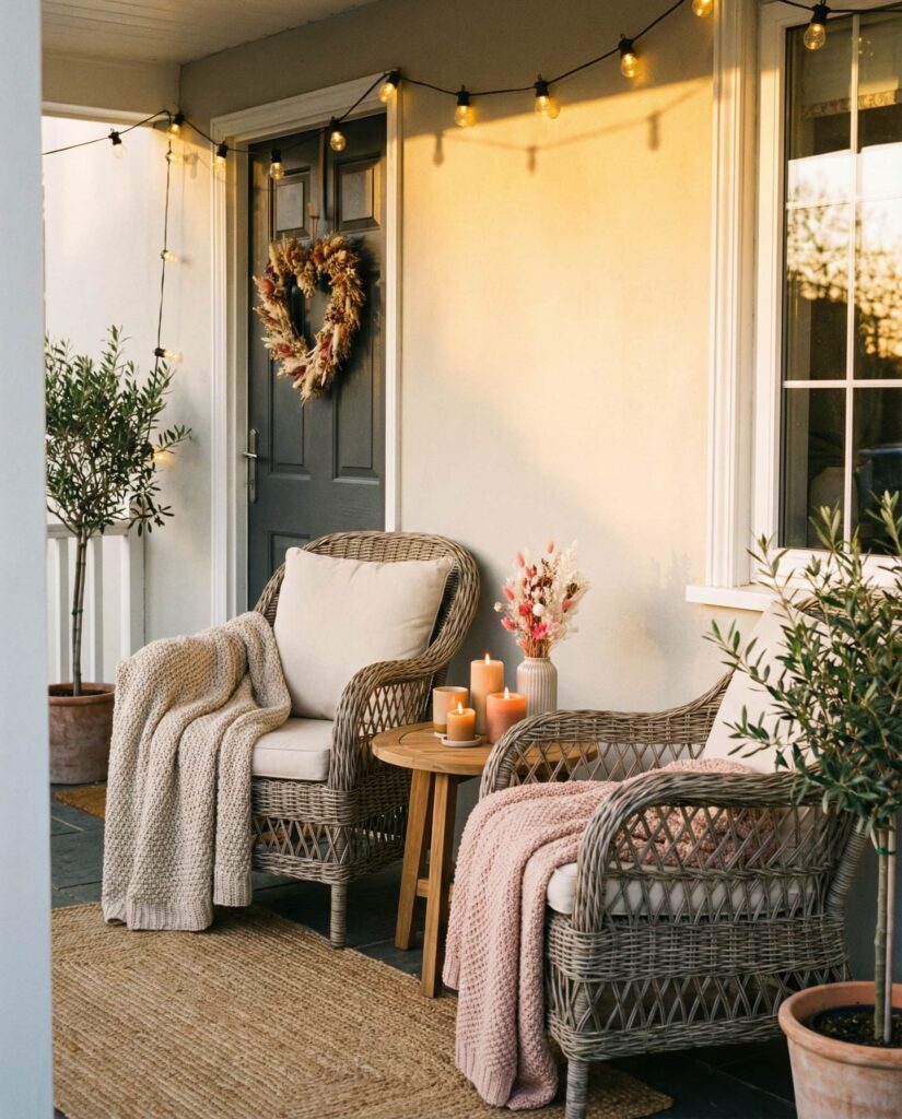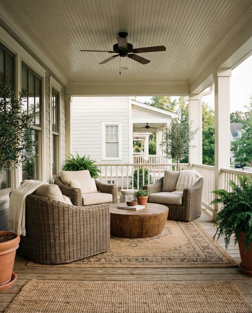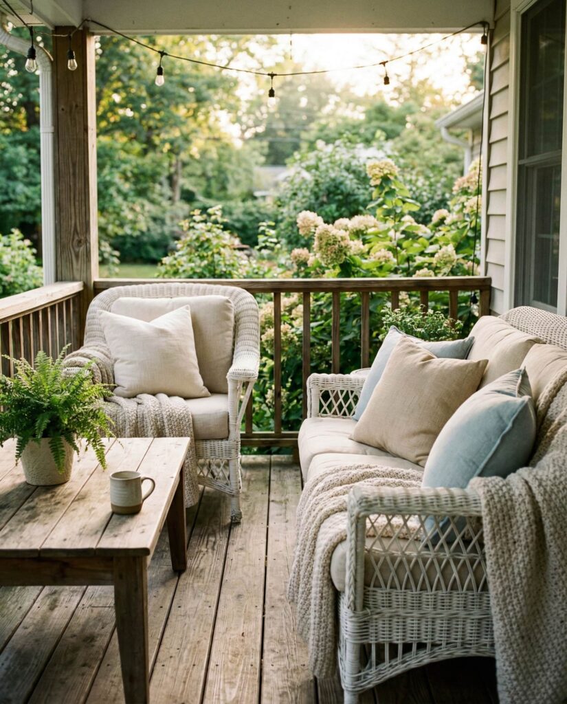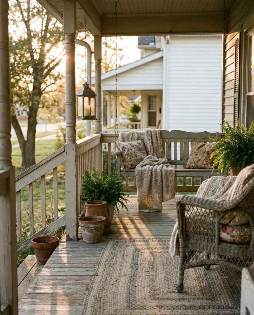 A Cozy back porch focuses on privacy and decompression, especially when connected to a backyard garden or green space. Unlike the front-facing porch, this area is more personal, often styled with loungers, throws, and warm lighting. I’ve noticed many homeowners treating this space like a quiet escape after work, mirroring trends discussed on The Spruce. It works equally well for cottages and contemporary homes, offering a relaxed contrast to busier interiors. Materials lean tactile—wood, linen, soft metals—while layouts remain flexible. This porch style proves that luxury in 2026 is less about size and more about emotional comfort and intentional design.