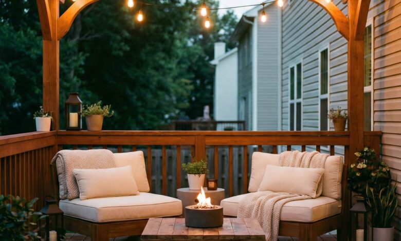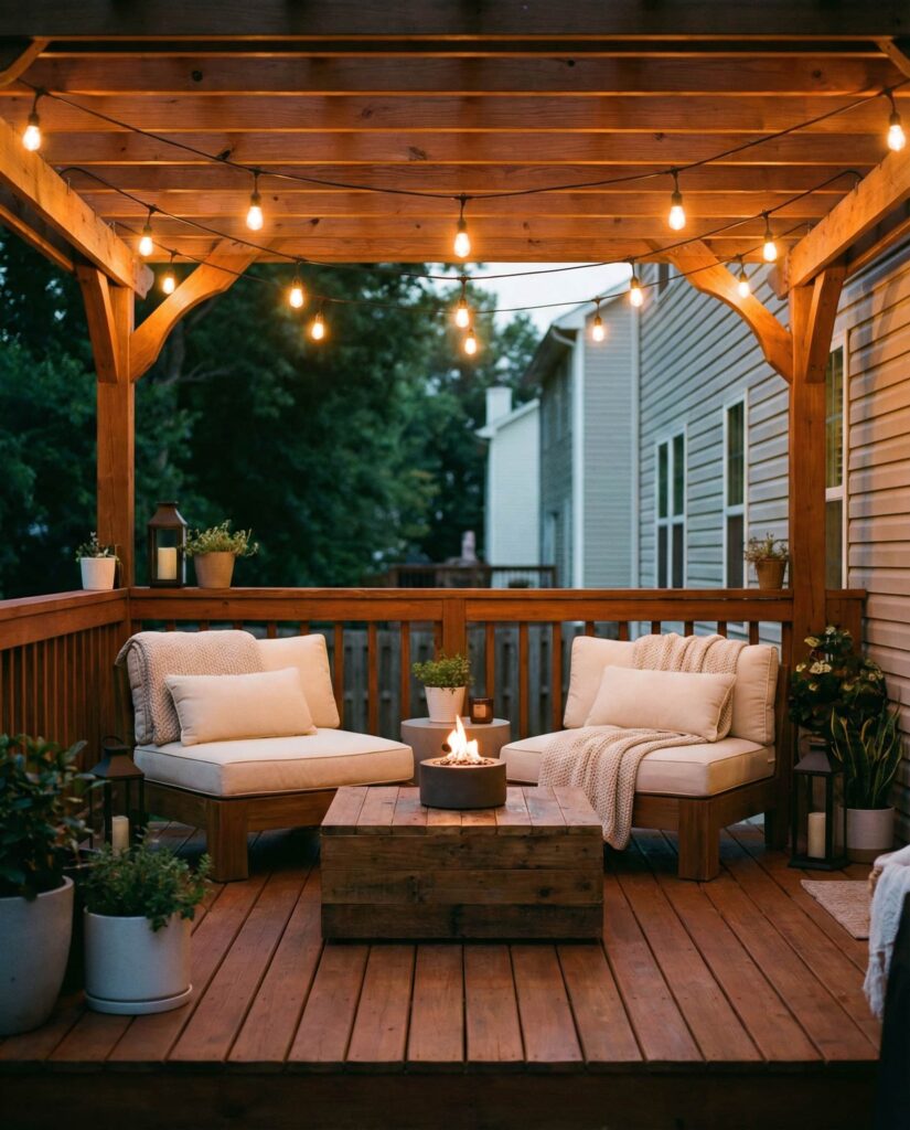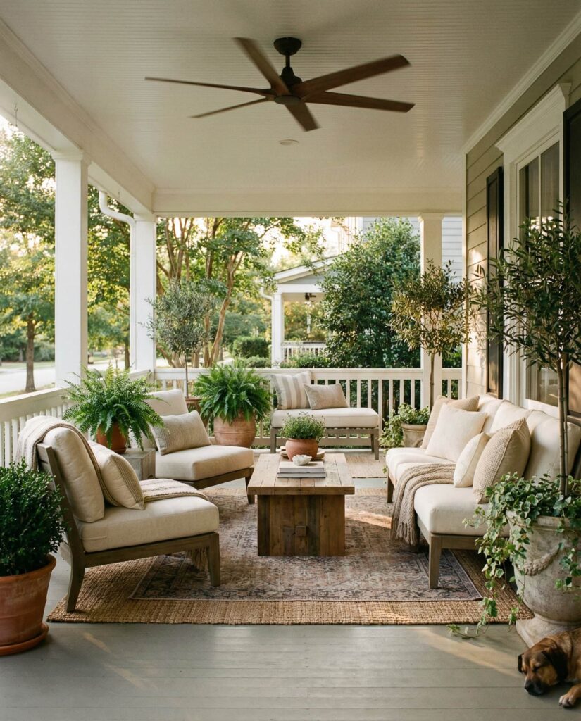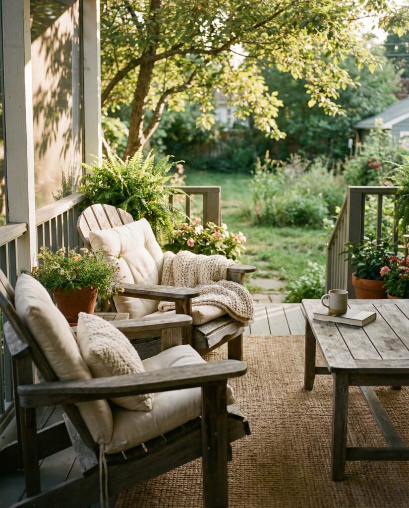 A Cozy back porch inspired by Cottage style brings softness and familiarity to outdoor living, especially when opening onto a backyard. This idea focuses on comfort-driven furniture, gentle color palettes, and natural textures that feel relaxed rather than styled. I’ve noticed these porches often become daily-use spaces instead of occasional ones. Magnolia frequently highlights cottage-inspired outdoor areas for their emotional appeal. The result is a porch that feels timeless, calming, and deeply personal, perfect for slow mornings or quiet evenings.
