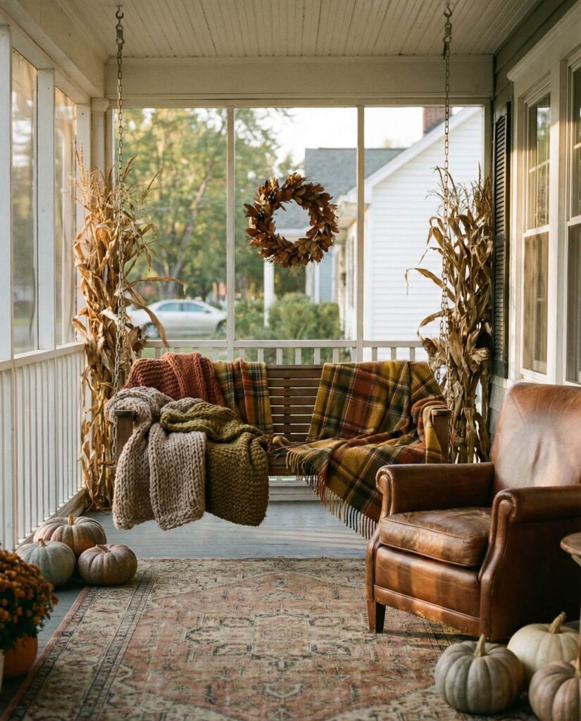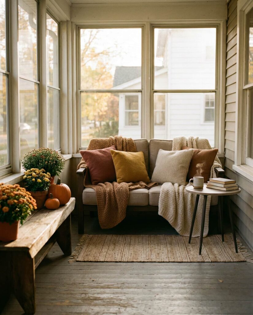 An Enclosed front porch designed for fall focuses on warmth, texture, and seasonal comfort without full exposure to the elements. Soft seating, layered textiles, and warm-toned décor make it an ideal spot during cooler months. I’ve personally enjoyed enclosed porches most in autumn, when crisp air meets filtered sunlight. Better Homes & Gardens often highlights enclosed spaces as ideal seasonal retreats. This porch bridges the gap between outdoor ambiance and indoor comfort beautifully.