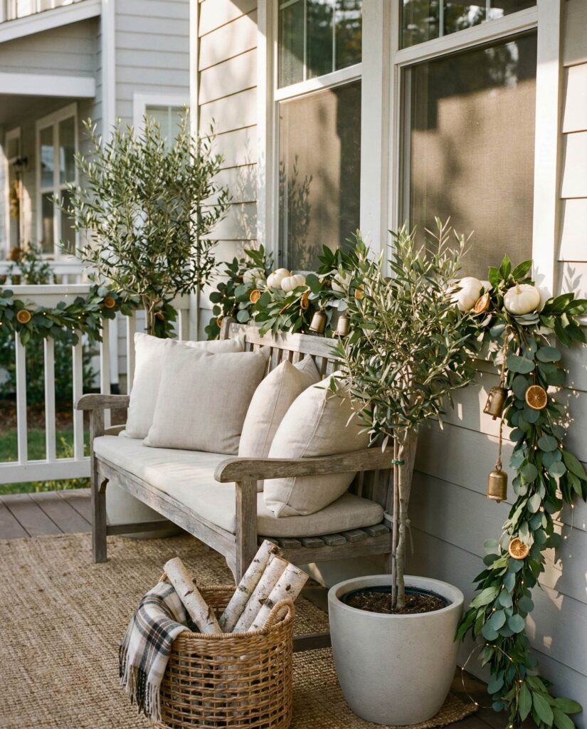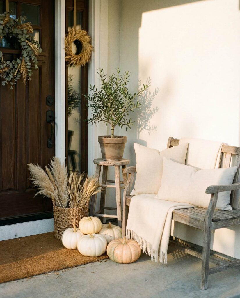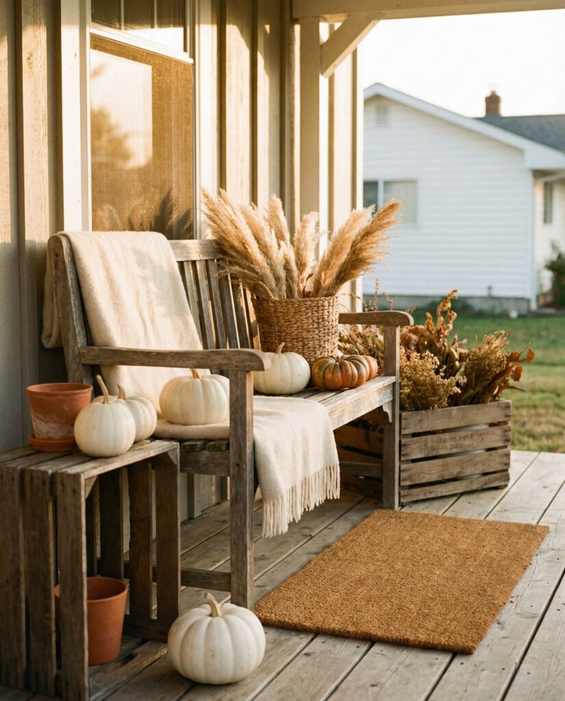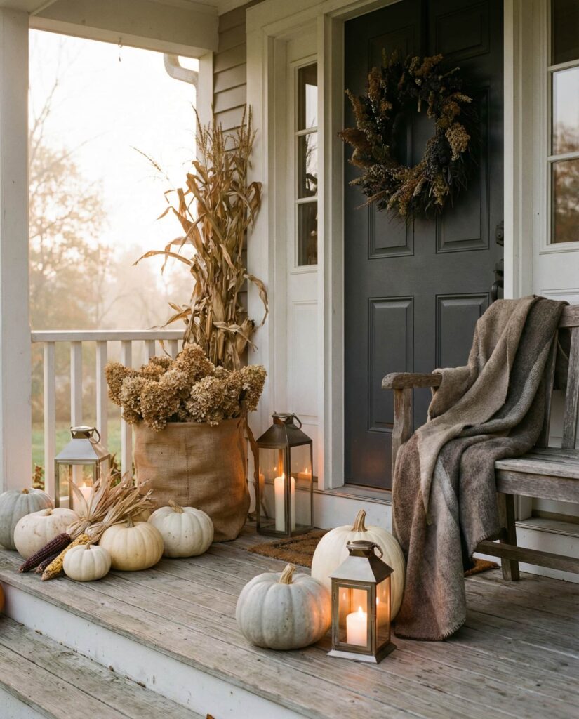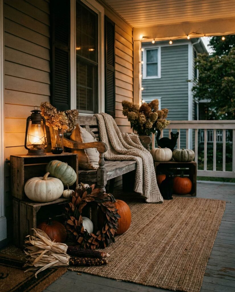 The Simple fall front porch embraces restraint, focusing on texture over excess. Located at the Front of the home, this style uses natural elements like wood, dried grasses, and muted pumpkins to create warmth without clutter. It’s especially appealing for fall when homeowners want seasonal character without full redecoration. I’ve personally leaned into this approach after years of overdoing autumn décor—it feels calmer and more grown-up. Martha Stewart Living often advocates this less-is-more philosophy, proving that seasonal updates don’t need to feel temporary or kitschy. The result is an inviting entrance outside that transitions smoothly into winter.
