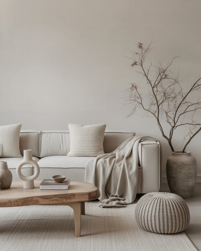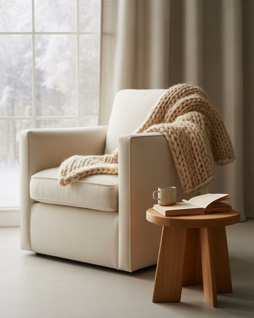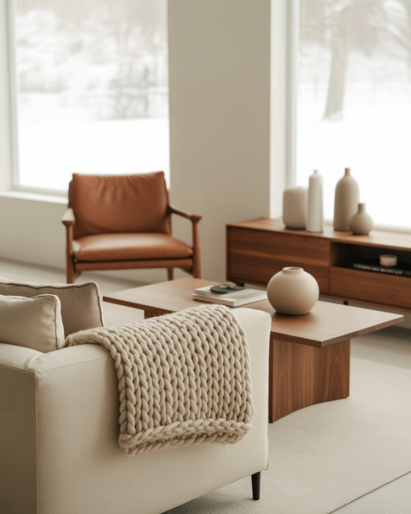 A living room in winter thrives on texture. Soft wool throws, creamy knit pillows, and natural wood accents give depth without clutter. For small spaces, focus on a restrained color palette — ivory, sand, and pale gray — creating calm after the visual rush of Christmas. This approach also suits the home after Christmas, when simplicity feels refreshing. Add a single sculptural vase for an artful touch.