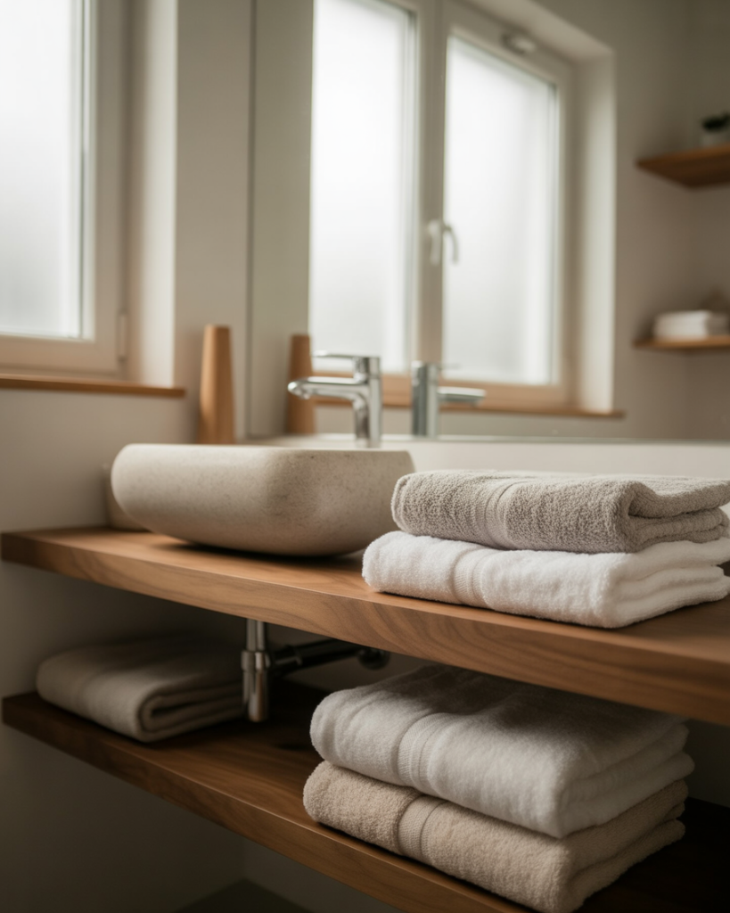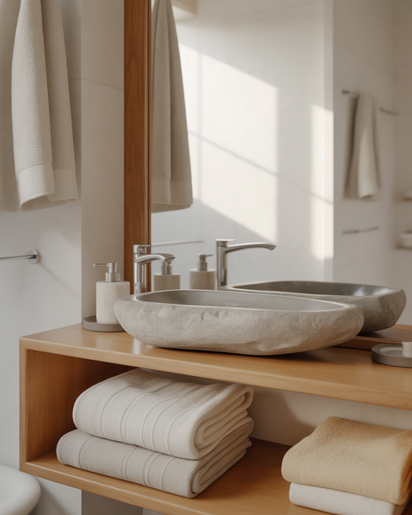 Softness defines the bathroom in winter. Layer pale towels, natural stone soap dishes, and wood trays to create a spa-like atmosphere. For small spaces, rely on soft diffused lighting and organic materials. These ideas for the home invite relaxation, transforming everyday routines into mindful rituals that feel soothing and elegant after Christmas.