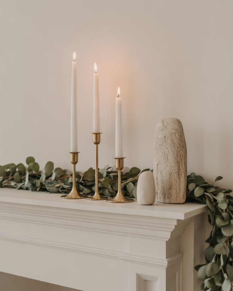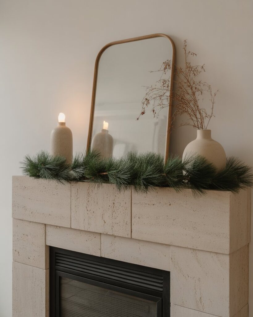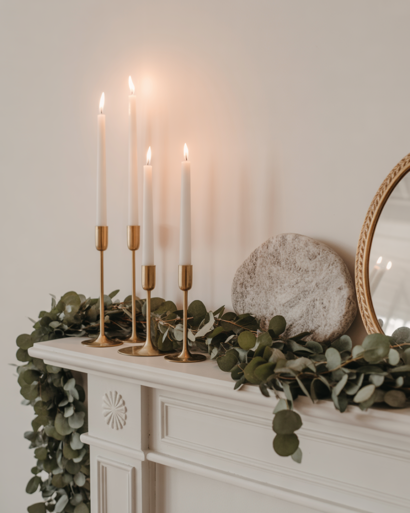 Elevate the mantel with a blend of simplicity and subtle richness. Layer vintage brass candlesticks beside natural stone or wood decor for balance. Keep garlands understated — eucalyptus or white pine rather than glitter. This minimalist approach keeps the home cozy without excess, making it ideal for fireplaces and the home 2026 aesthetic.