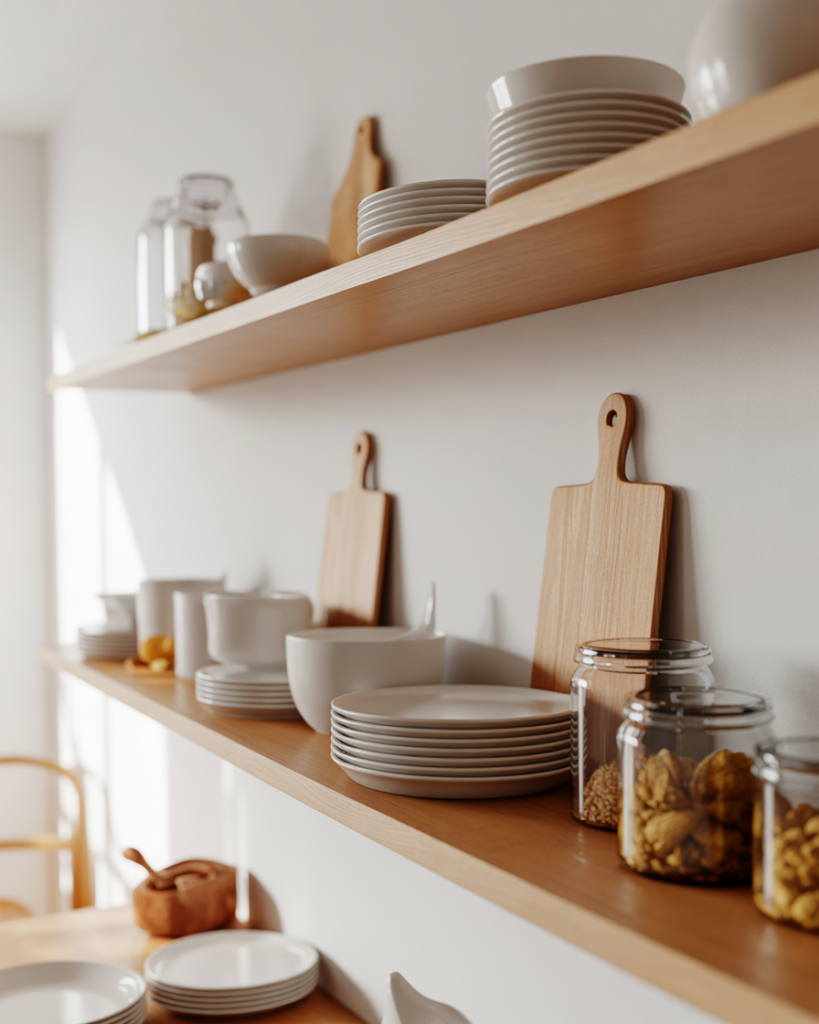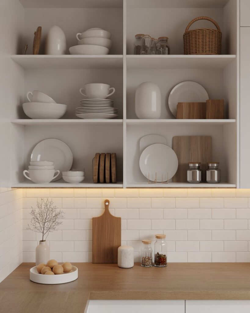Simplify your kitchen with open shelves that showcase useful beauty — white ceramics, wood boards, glass jars. A few dollar tree diy storage ideas can make even small spaces elegant. This clean approach enhances the home cozy feel, combining utility and minimal style that celebrates light and order.