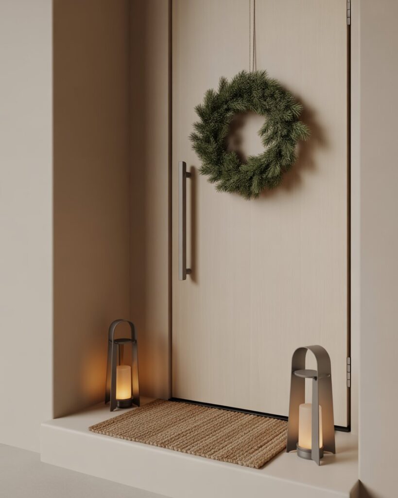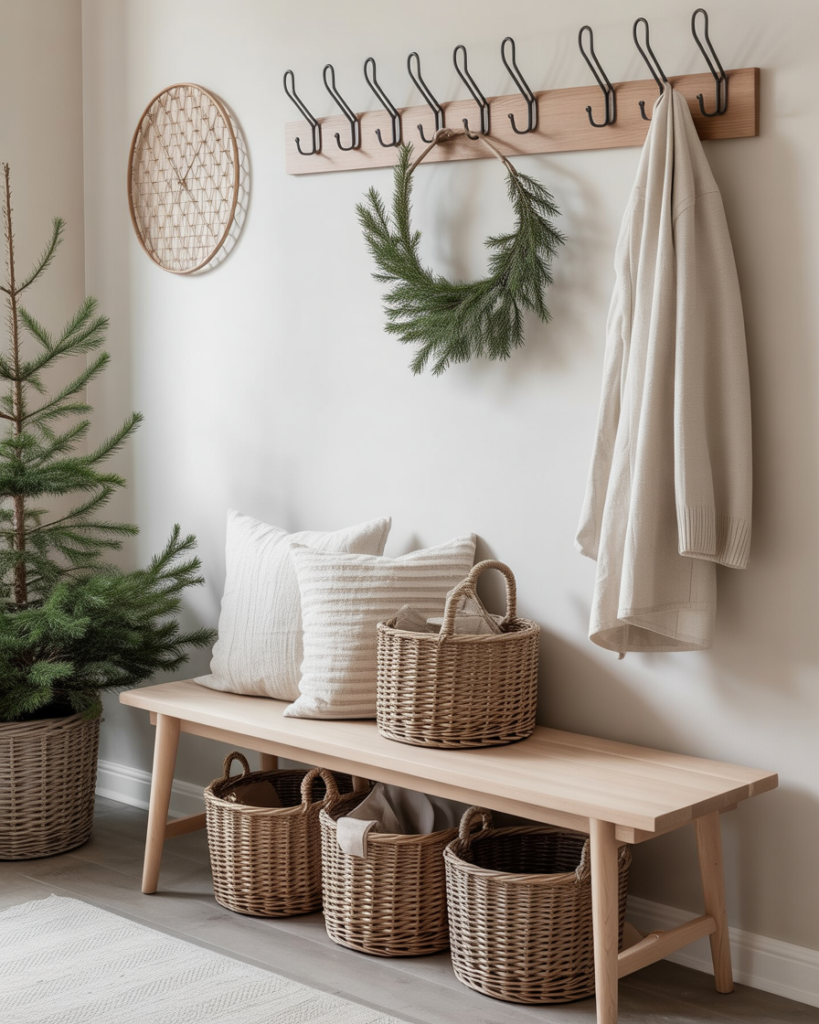 Transform entryways into a warm yet streamlined welcome. Think pale wood benches, woven baskets, and matte black hooks — a nod to Nordic design. Even a small front porch can feel elevated with repurposed lanterns or evergreen branches. These ideas for entryways embrace functionality with minimalist flair while keeping the home cozy and organized through the cold months.