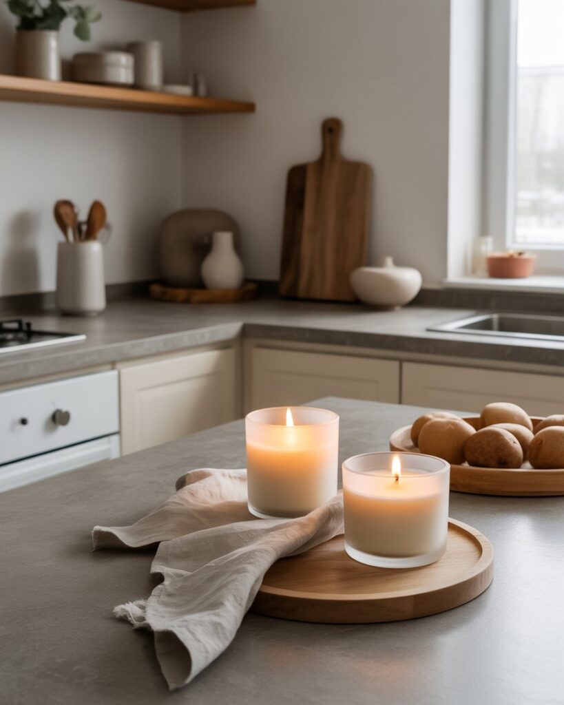 The kitchen becomes the heart of winter gatherings. For the home rustic yet refined, combine natural stone countertops with linen napkins and muted ceramics. Incorporate dollar tree diy candles in frosted jars to create affordable warmth. This style works beautifully for small spaces, where subtle tones and layered lighting make the area glow softly without feeling busy.
