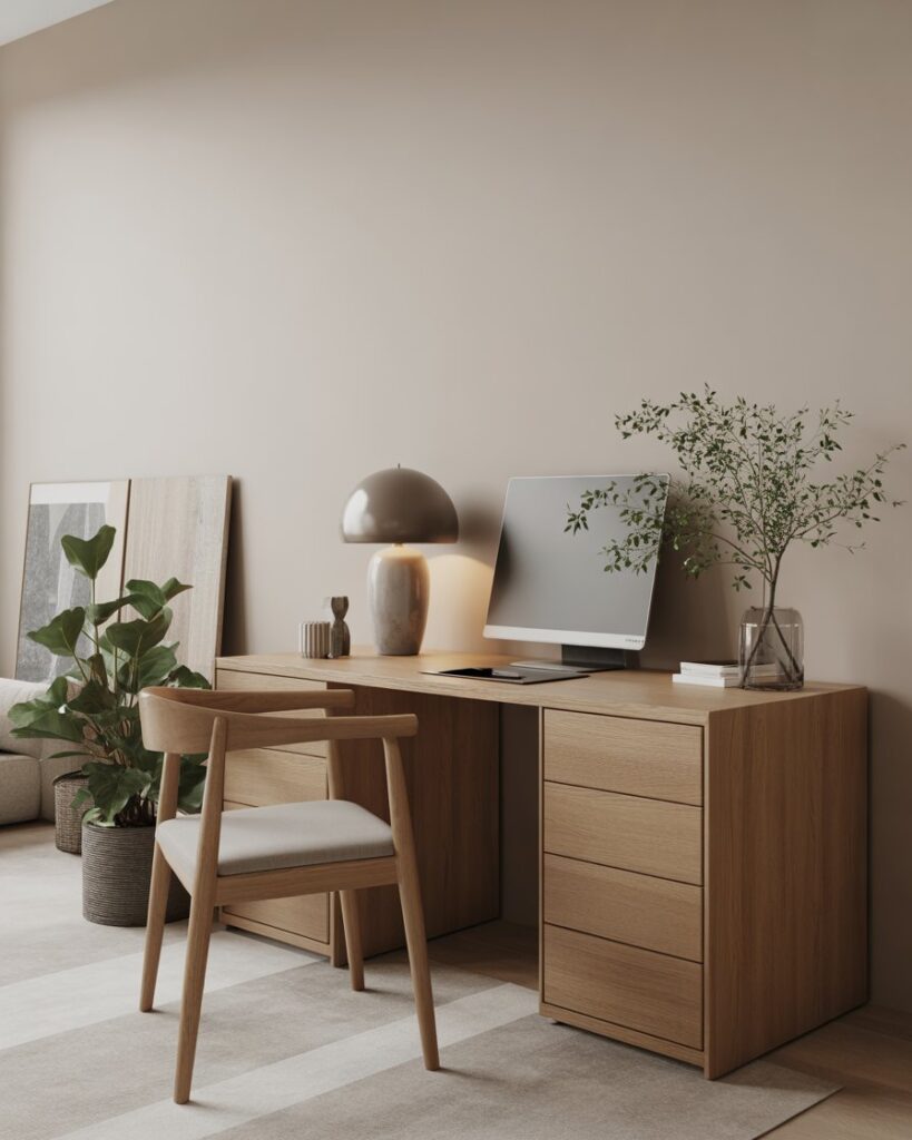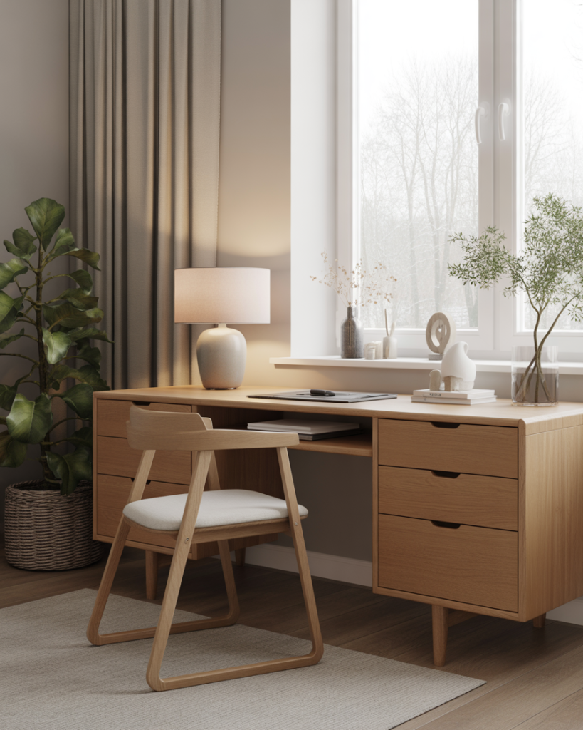 Cold months invite focus and clarity, making winter ideal for updating your office. Use natural materials like bamboo desks or oak shelves paired with off-white fabrics to keep the space grounded. A single plant or ceramic lamp adds visual warmth. This look suits for the school or for the home office, especially in small spaces seeking calm productivity and minimal distractions.