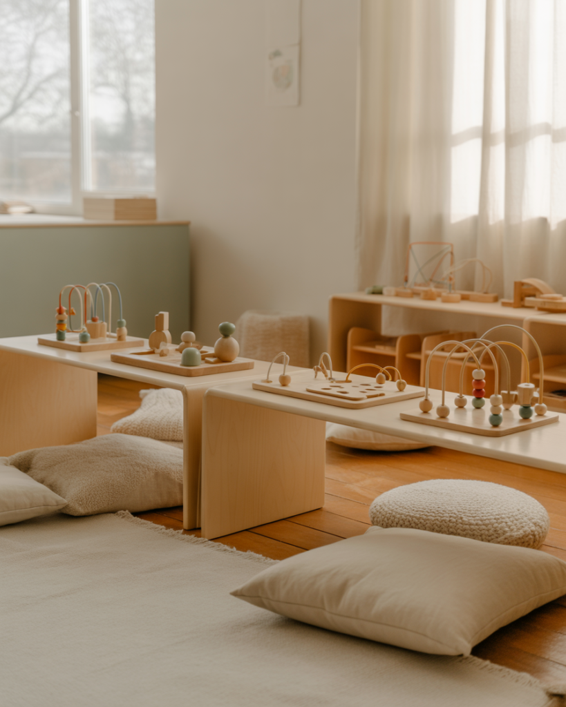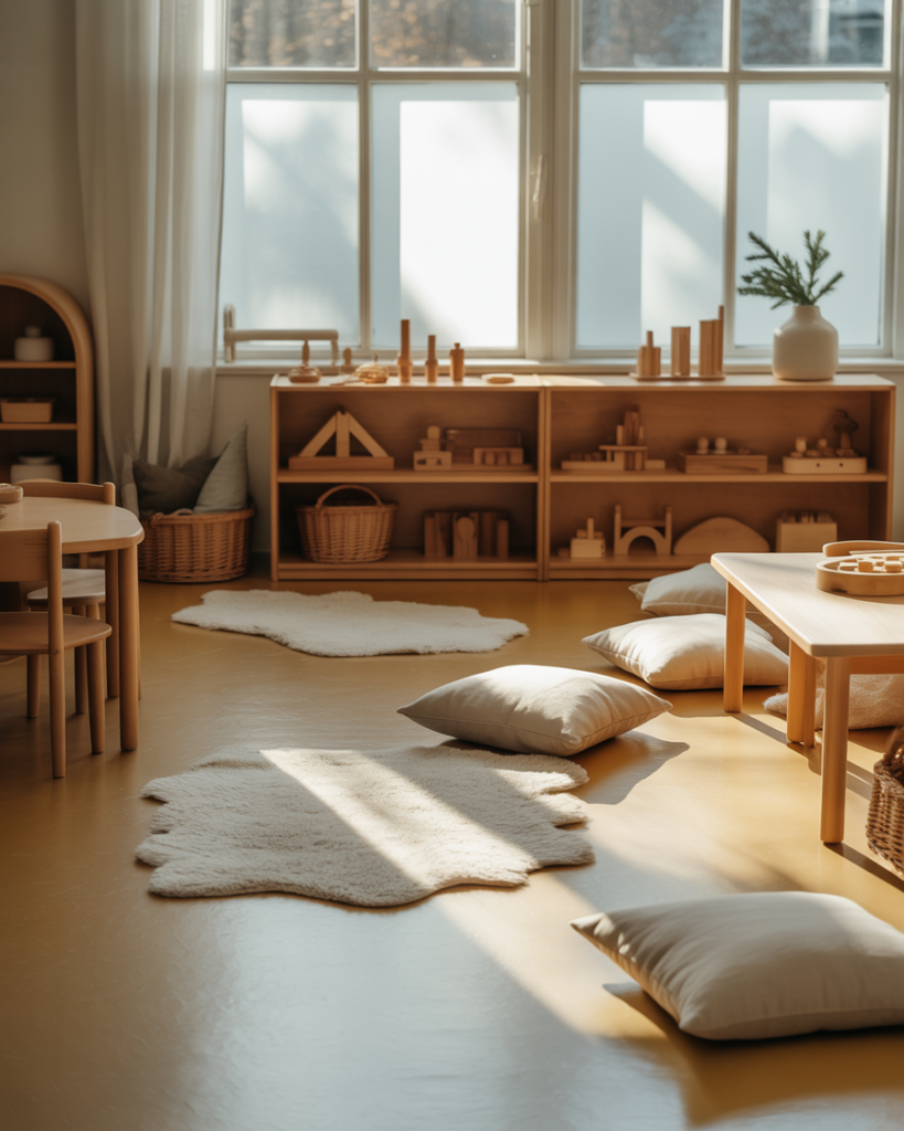 Winter in kindergarten or nursery rooms calls for softness. Add warm neutrals, plush rugs, and natural wood toys to keep comfort first. These ideas for school and for the home balance minimal aesthetics with playful charm — ideal for small spaces needing coziness without clutter.