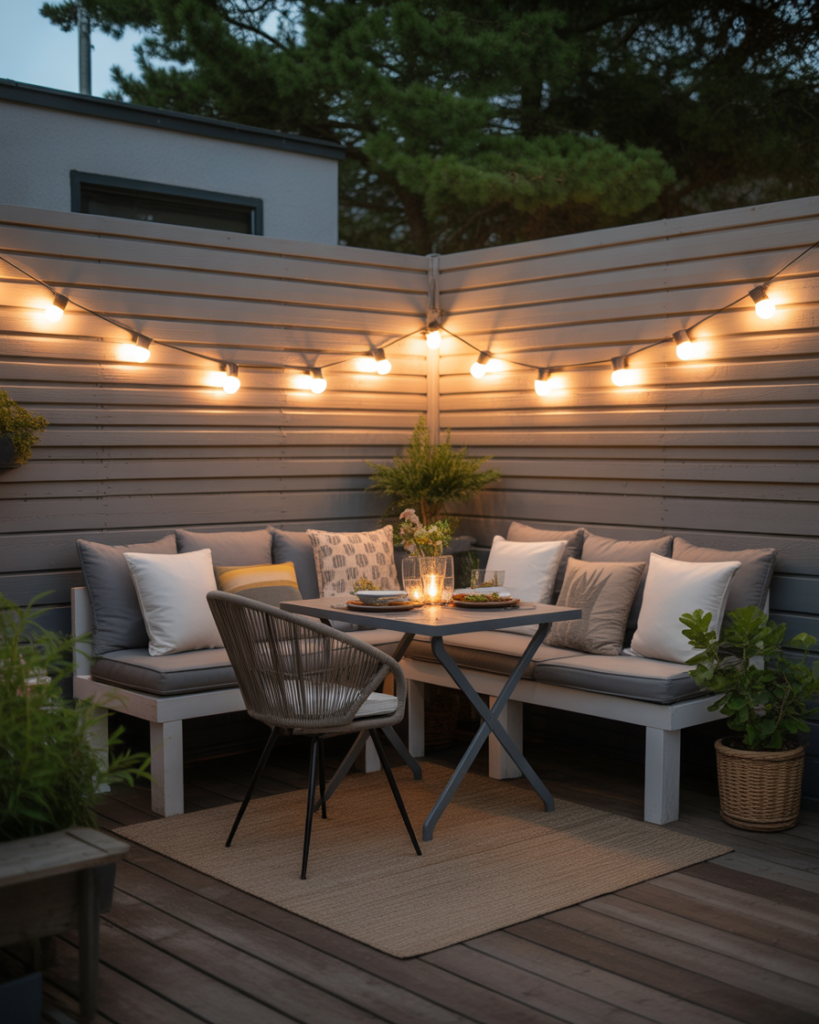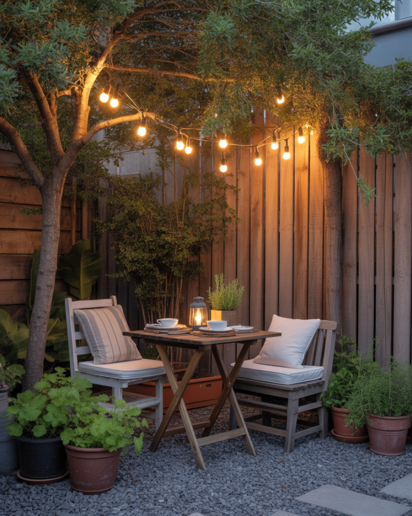 A tiny dining corner with thrifted outdoor furniture can transform unused space into a welcoming meal spot. Add cushions or lanterns for an easy upgrade that feels like a patio café. I’ve set up small dining nooks for friends in compact yards, and they always become the go-to place for weekend breakfasts. Works beautifully near a pool or garden.
