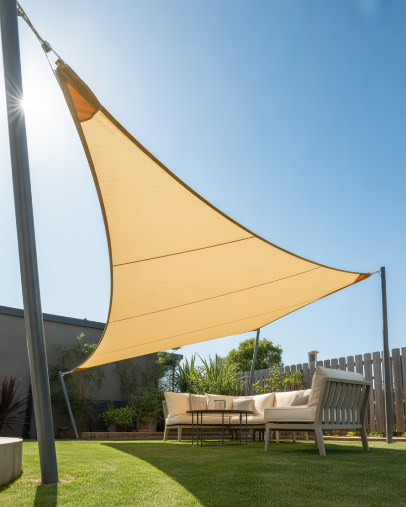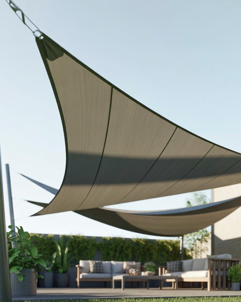 Installing a shade sail provides outdoor shade without the cost of a full structure. It’s a stylish, airy solution I’ve used for patios where heat was overwhelming. Lightweight, modern, and affordable, it works especially well in desert climates or sunny yards where comfort is key. Great for seating, dining, or lounging zones.