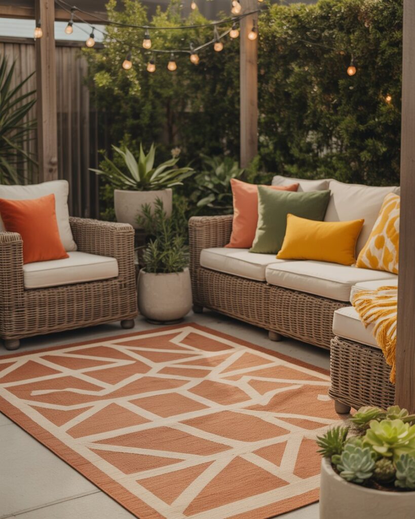 Using an outdoor rug with updated patio furniture perks up any dull corner. A friend refreshed her own space with secondhand chairs and a patterned rug, transforming it from plain to polished. Perfect for renters who want impact without commitment and for anyone craving warm, stylish outdoor seating.