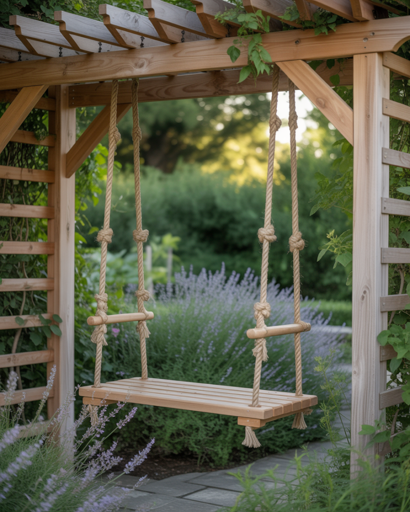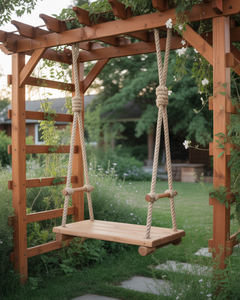 Adding a swing beneath a pergola combines charm, comfort, and movement. I’ve seen homeowners on a tight landscaping budget add one using reclaimed wood and rope, and the cozy results felt like a high-end retreat. Ideal for reading, relaxing, or enjoying breezy evenings with a cup of tea.