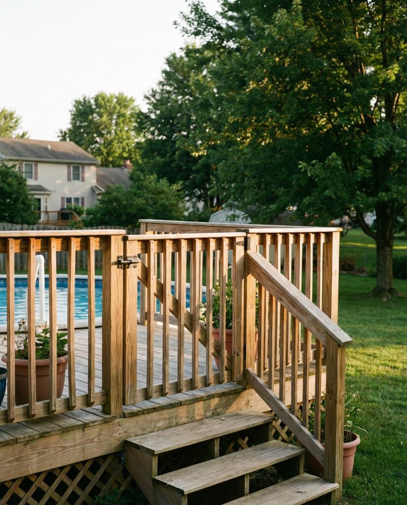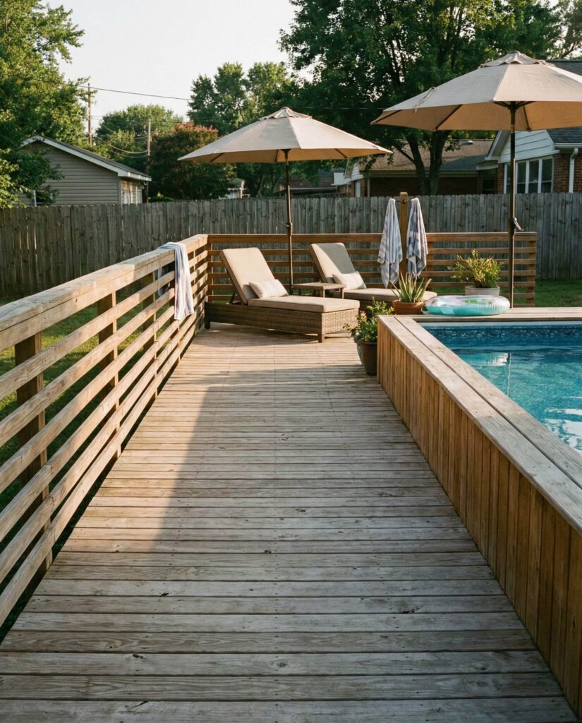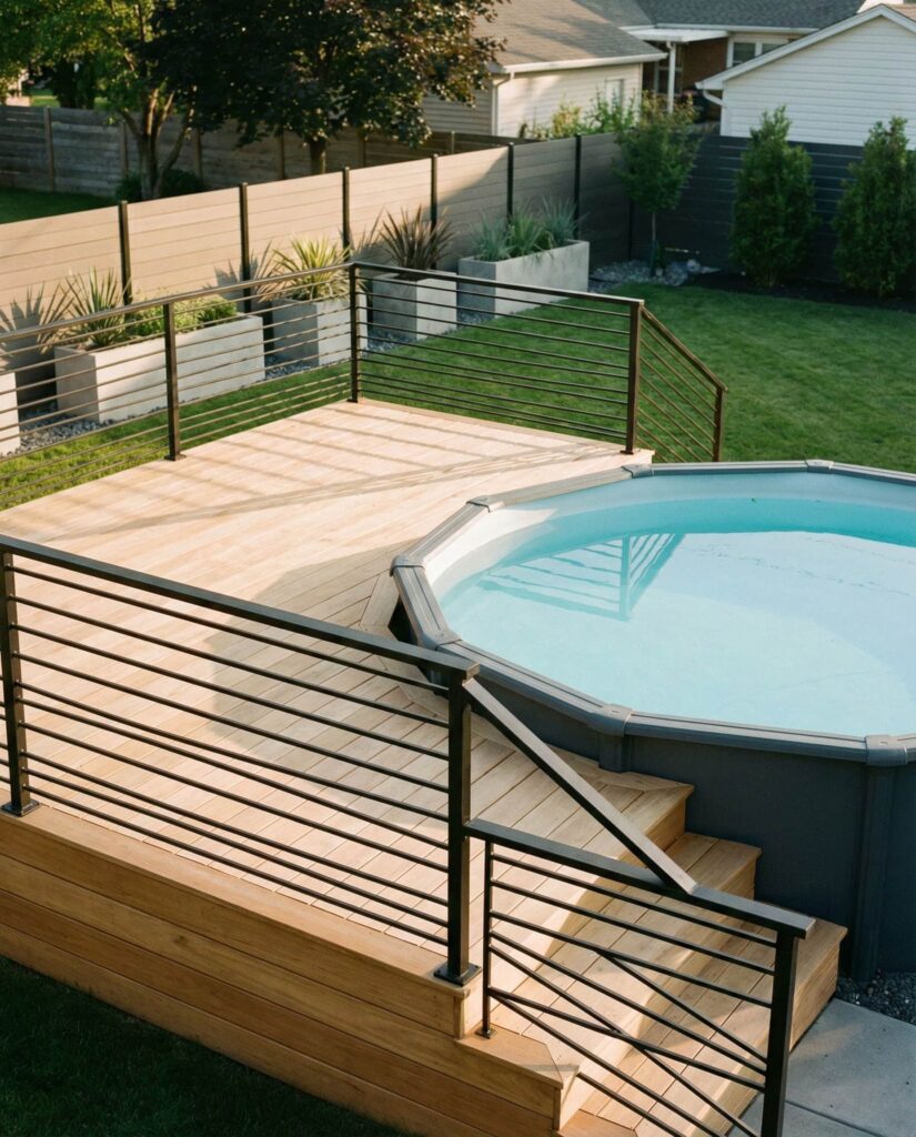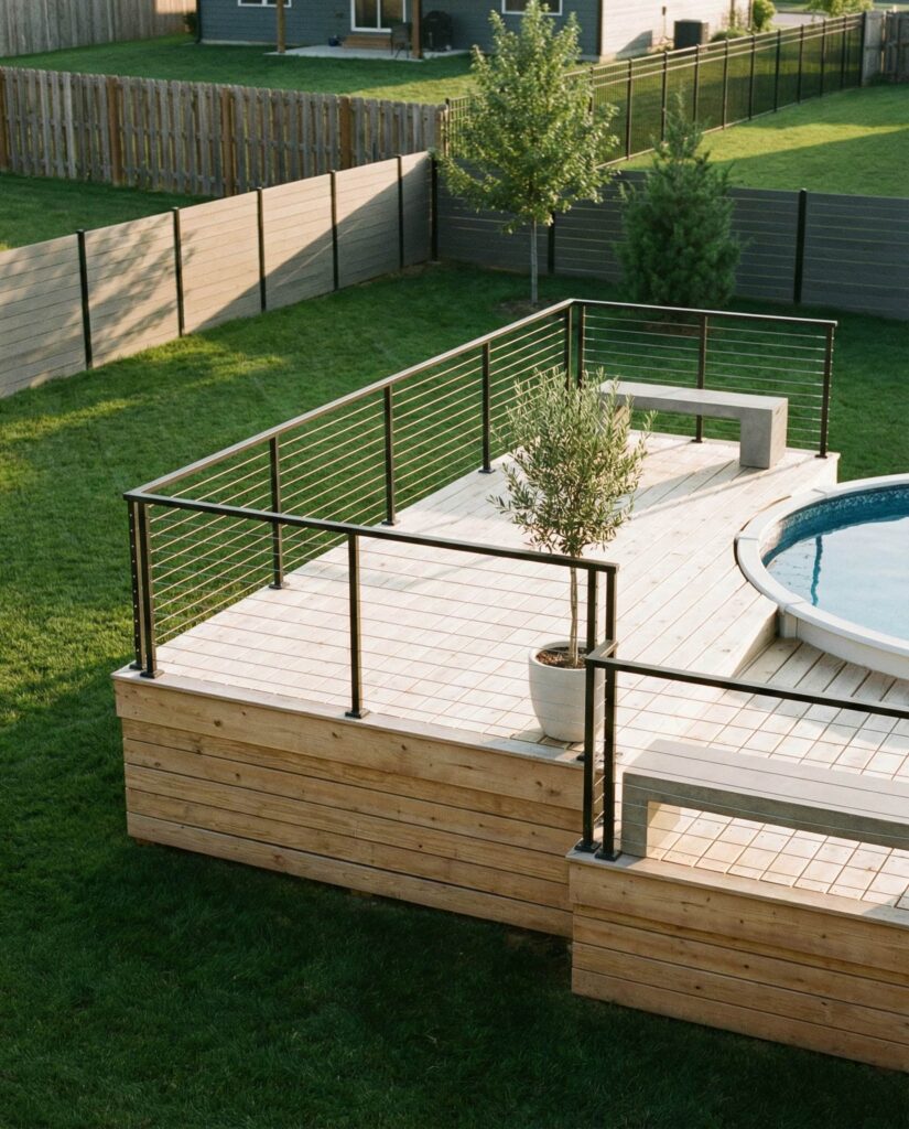 Clean-lined railing ideas are shaping a new wave of above ground pool deck ideas aimed at homeowners who prefer simplicity. These plans often use slim vertical or horizontal railings that feel more architectural than decorative. From my own observation, minimalist railings instantly make a deck look more expensive without adding complexity. Designers recommend neutral finishes and consistent spacing to maintain visual rhythm. This style suits contemporary homes and smaller yards where excess detail can feel overwhelming, proving that restraint can be just as impactful as embellishment.