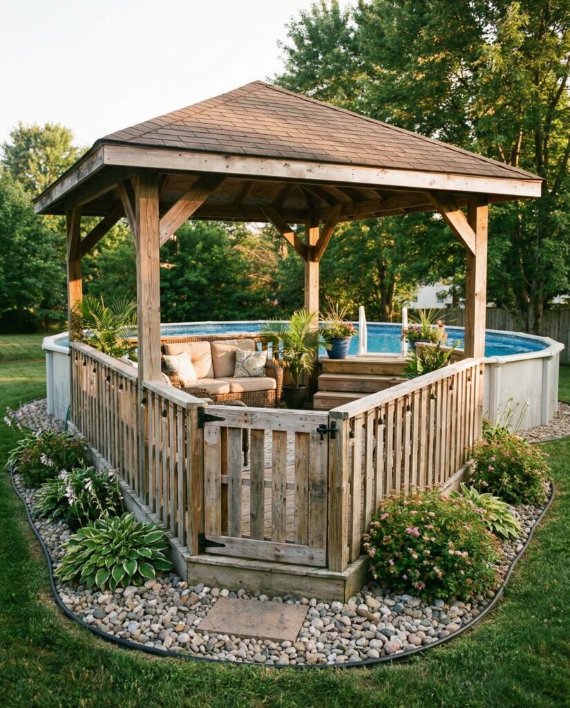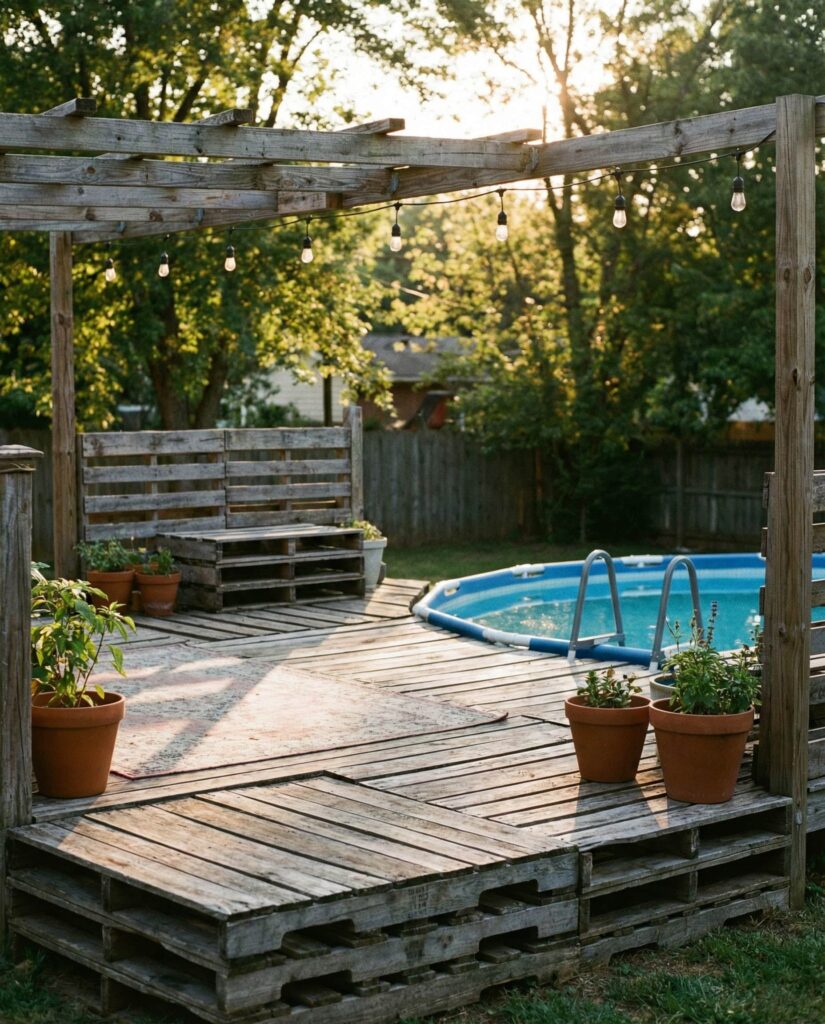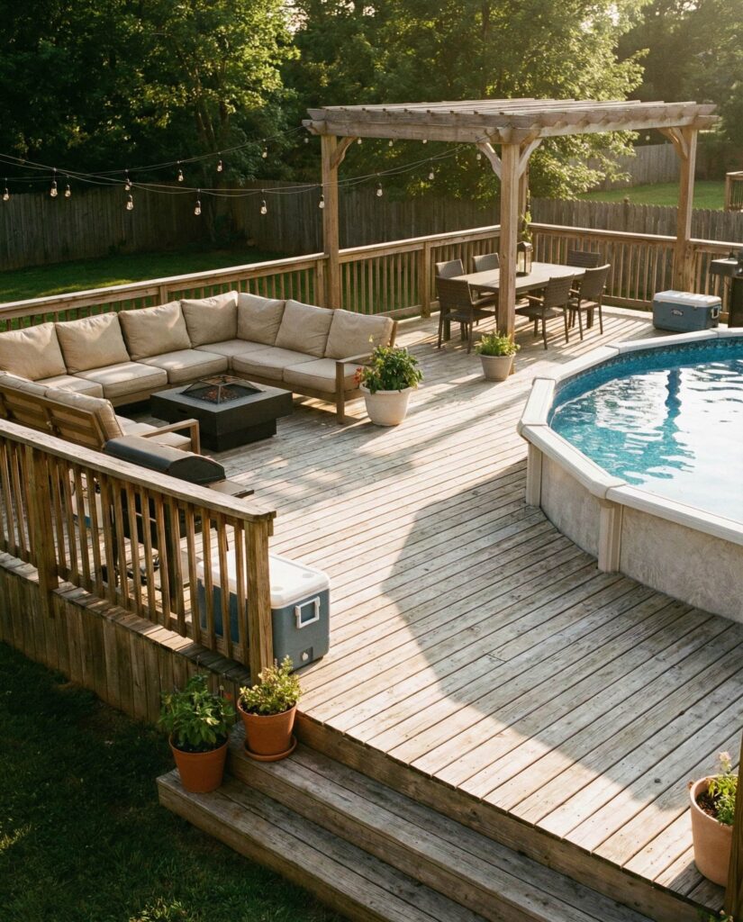 A covered deck anchored by a gazebo, secure gate, and thoughtful DIY touches like pallet accents defines forward-thinking above ground pool deck ideas. These kits and even plans free online make customization accessible. Homeowners often add railing ideas, subtle landscaping, or even ideas round with privacy fence elements for cohesion. I’ve seen how a covered deck extends the swimming season and protects furniture, making the investment feel smarter.