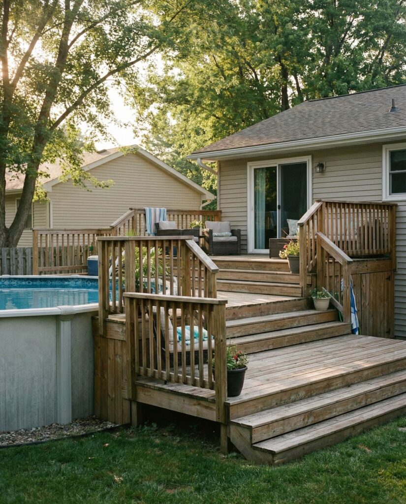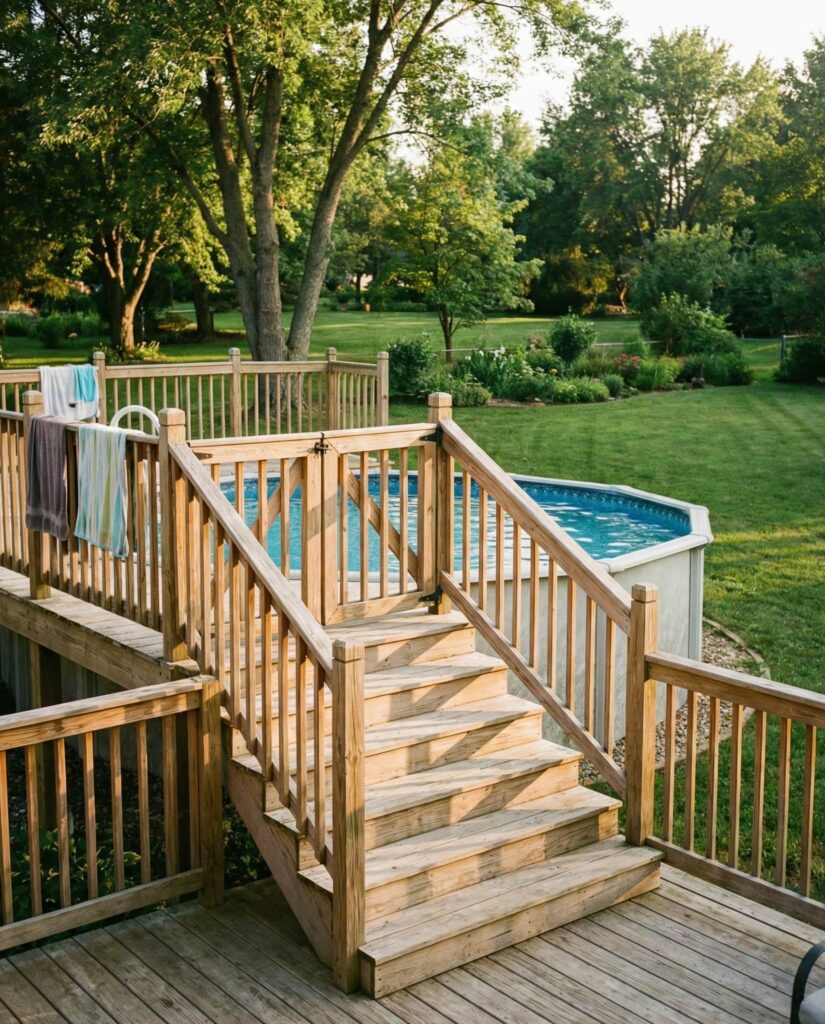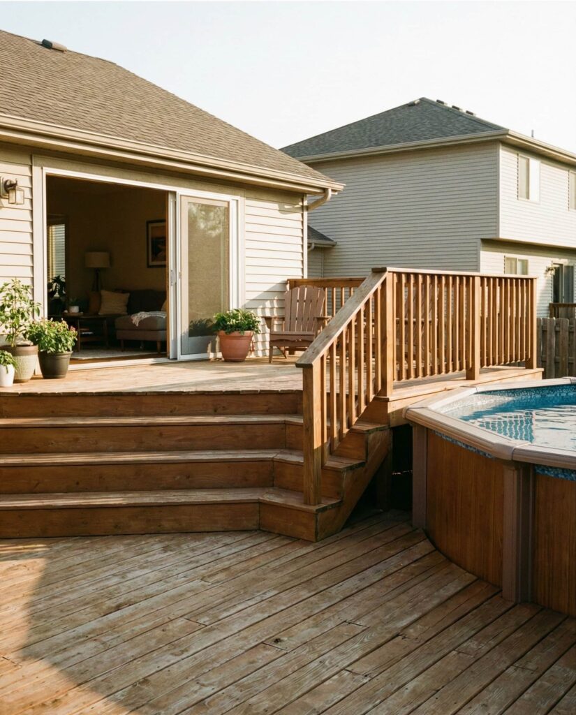 Above ground pool deck ideas that prioritize safety often begin with generous stairs and clear circulation plans. These designs are popular with families who want kids and guests moving comfortably without congestion. I’ve noticed that wider stairs naturally become informal seating during parties, adding unexpected functionality. Builders often pair them with non-slip finishes and sturdy railings for peace of mind. The deck feels welcoming and intuitive, encouraging use throughout the day rather than just during swim time.