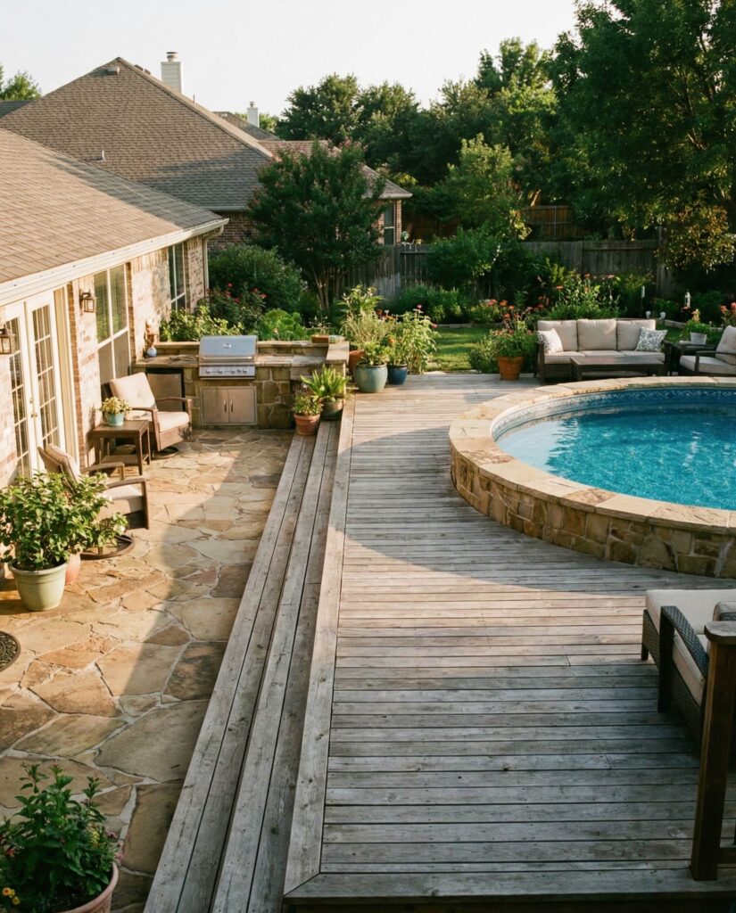 Blending an above ground pool deck with an existing house patio is one of the most natural ideas gaining traction. These plans aim to align materials and heights so the transition feels seamless. I’ve seen homeowners use this setup to create zones for dining, lounging, and swimming without physical barriers. Designers often advise keeping finishes consistent to visually tie the spaces together. The pool becomes part of daily outdoor life, not a separate destination at the edge of the yard.