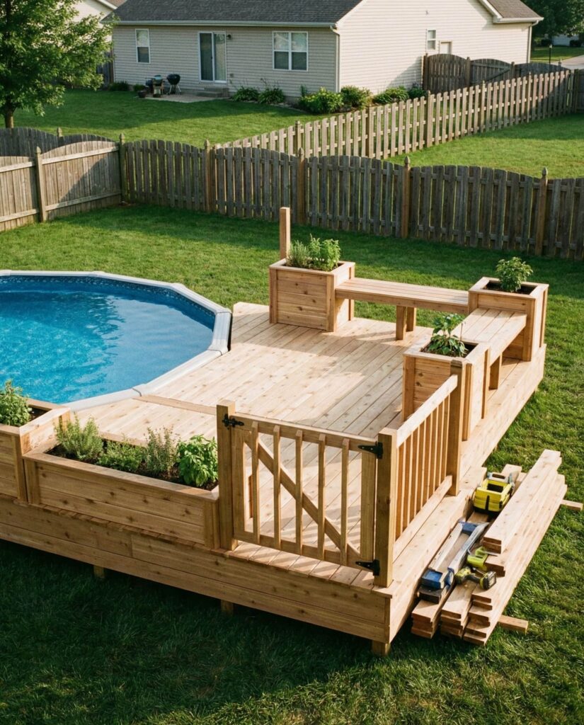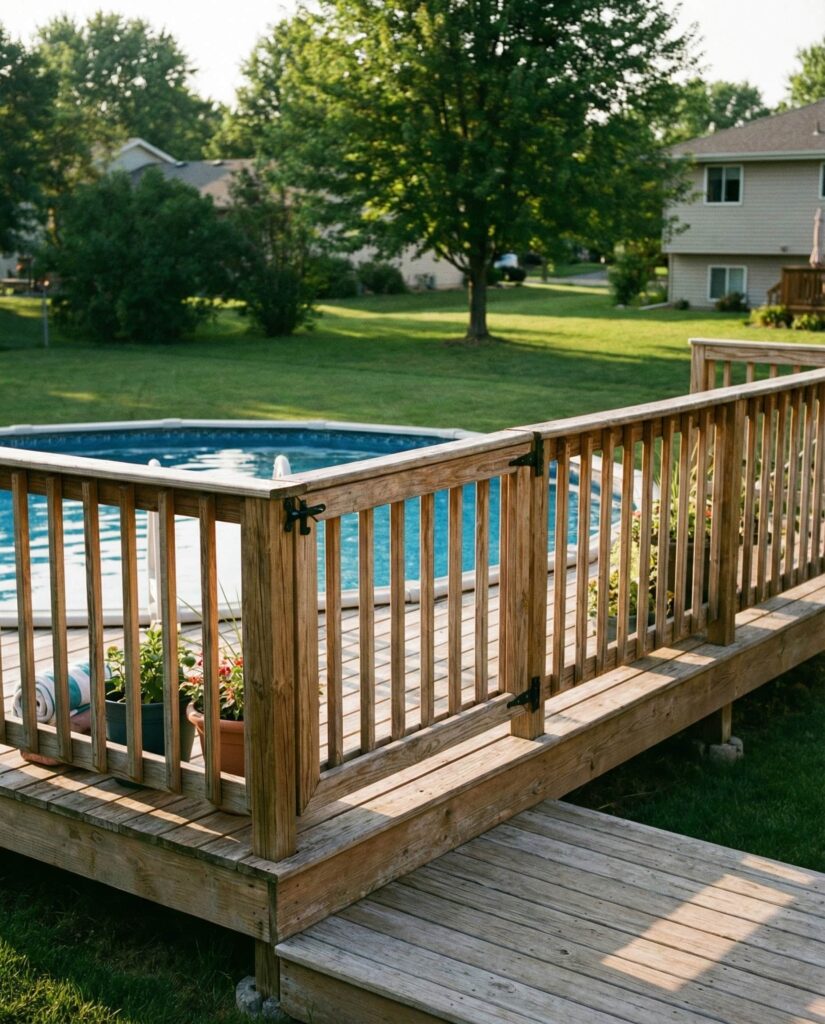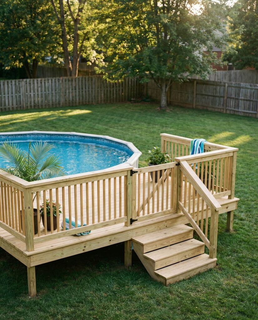 A dedicated entry gate is becoming one of the most practical above ground pool deck ideas, especially for households balancing safety and style. These plans clearly separate the pool zone from the rest of the yard, which is helpful for families with pets or young children. From my own neighborhood observations, a well-designed gate subtly changes how the deck is used, making it feel more intentional and secure. Designers recommend matching the gate material to the deck railing so it blends seamlessly instead of looking like an add-on. Beyond safety, a defined entry creates a sense of arrival that elevates even a modest pool setup.