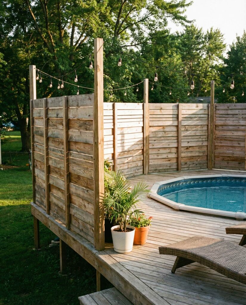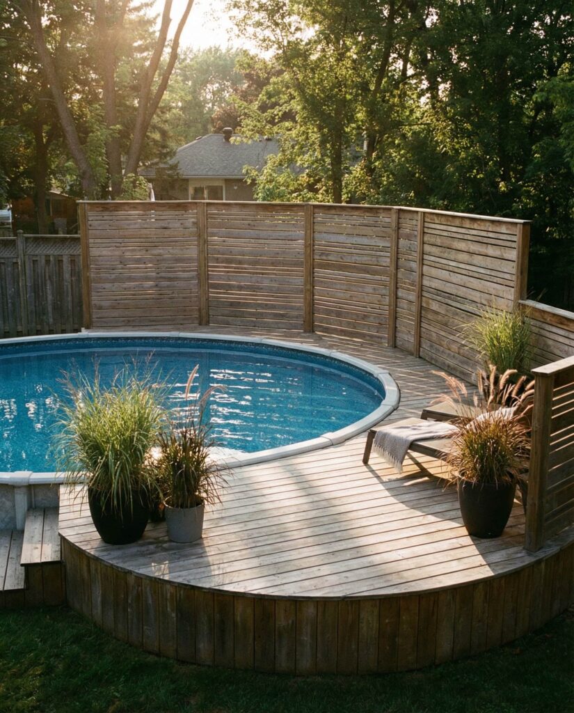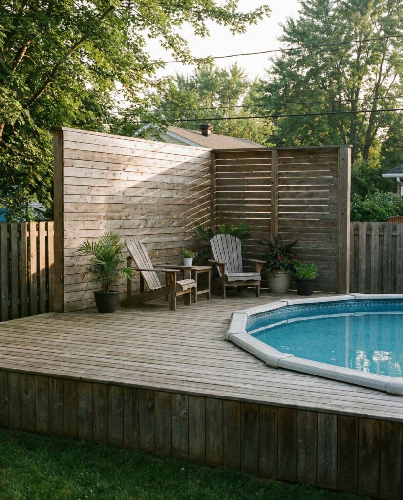 A privacy wall paired with a fence is becoming a defining feature in modern above ground pool deck ideas. These plans respond to tighter neighborhoods where homeowners want separation without closing off airflow. From my own experience, a partial privacy wall instantly changes how relaxed a pool area feels. Designers recommend mixing horizontal slats or screens with traditional fencing to avoid a boxed-in look. Done well, privacy elements also act as wind breaks and visual backdrops for lighting or plants, adding function beyond seclusion.